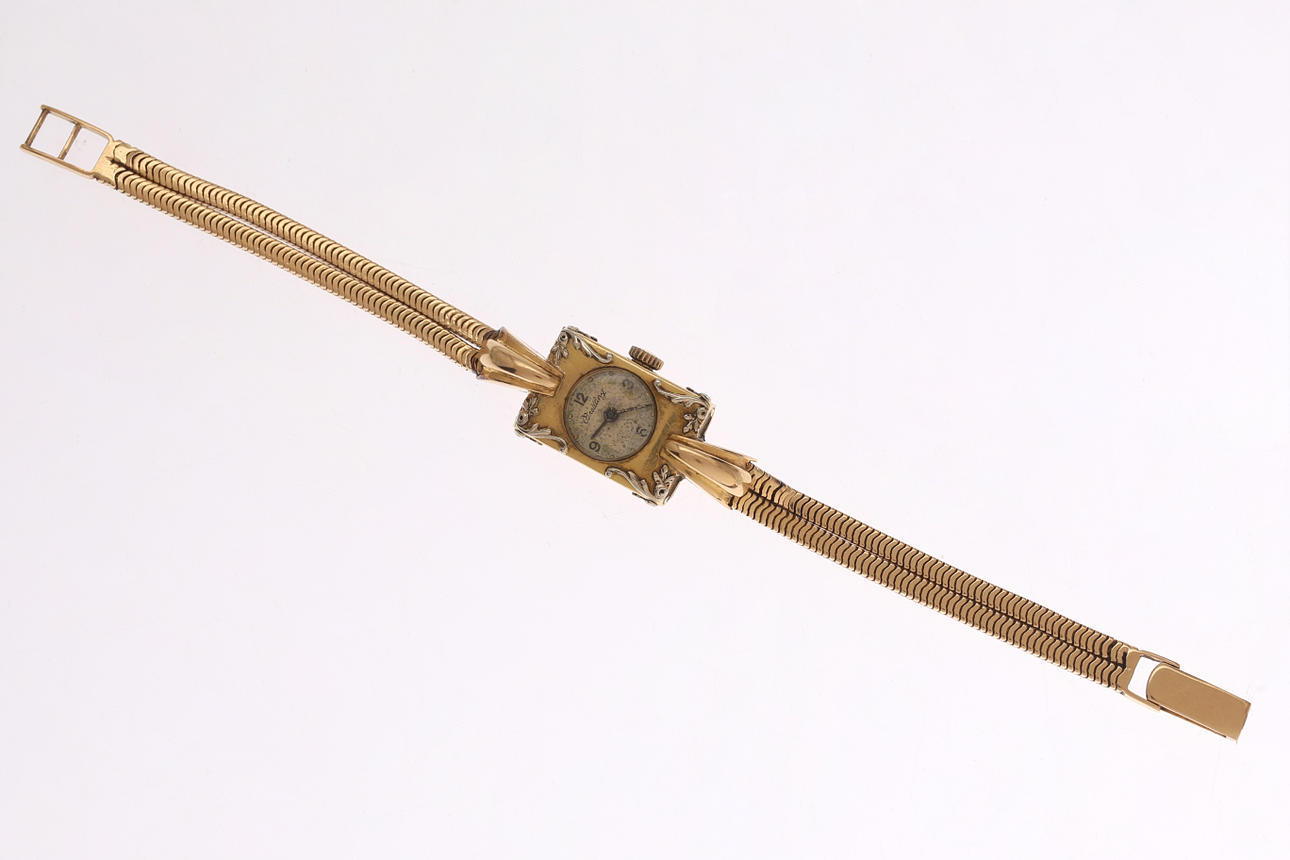 21 x 14 mm rektangulärt 18K guldfodral. Armband med dubbel kedja i 18K guld och klassiskt lås. Manuell reprörelse. 16 cm. 28,3 gr.
