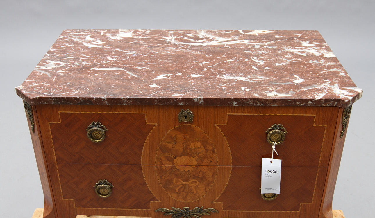 Intarsiadekor, mässingbeslag samt stenskiva. Längd 78, bredd 43, höjd 75 cm.