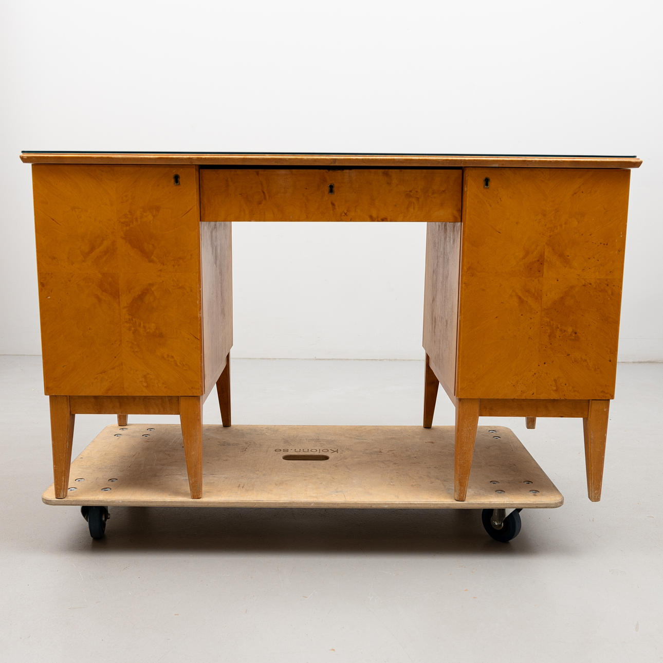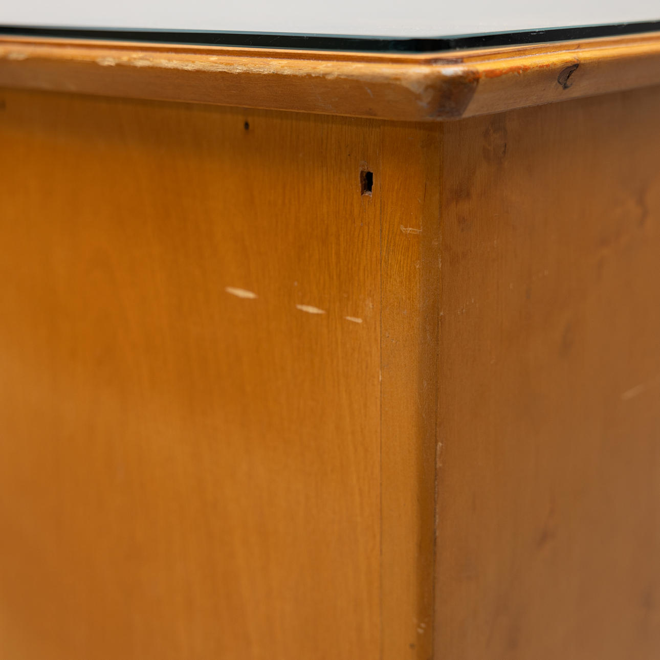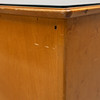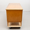 Täckande glasskiva. Två dörrar, den ena med 4 lådor, den andra ej öppningsbar. Låda i sarg. Bredd ca 130, höjd 77,5 och djup 64,5 cm.