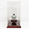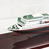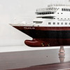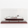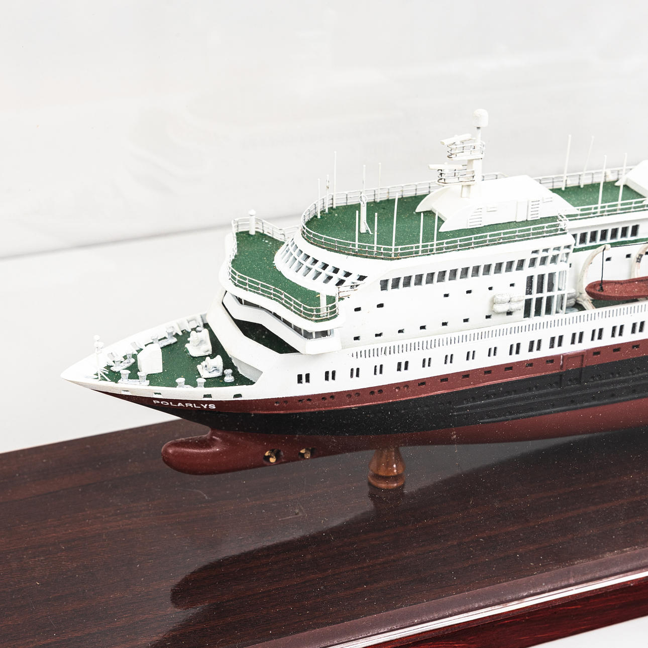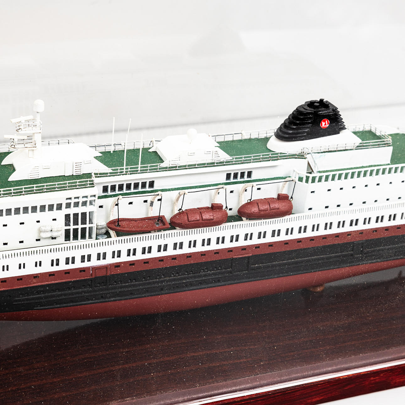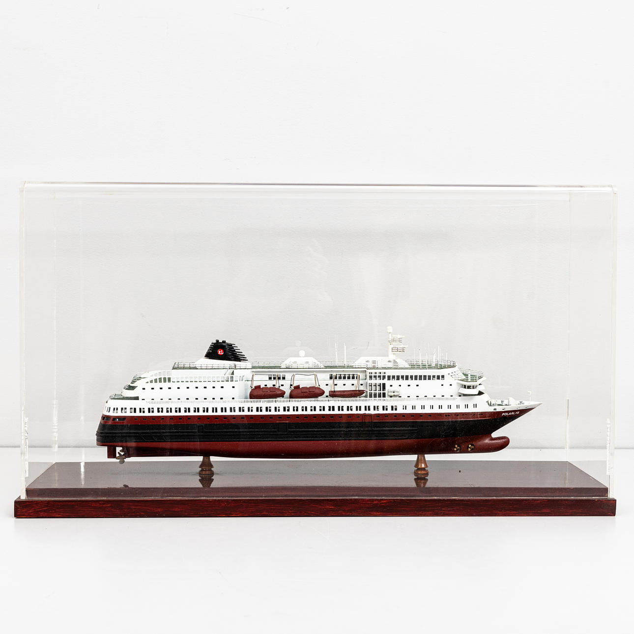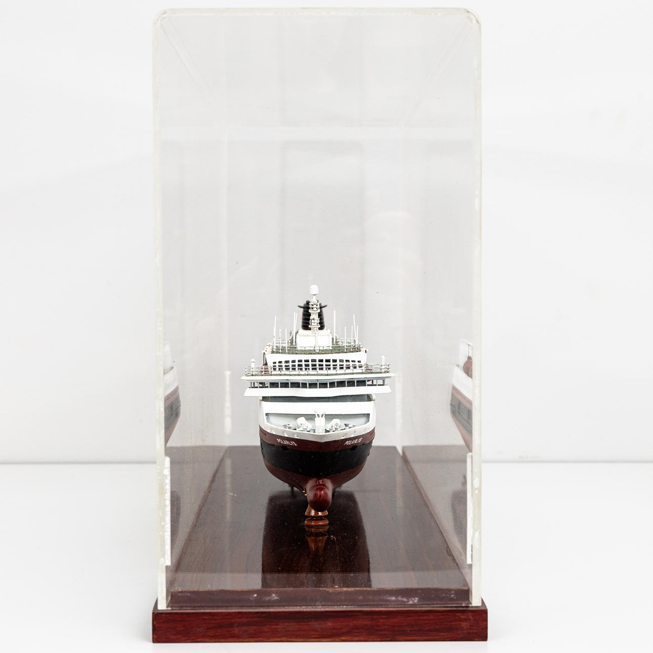 Fartygsmodell längd 44 cm på träsockel med huv av plexiglas. Total längd 57 cm.