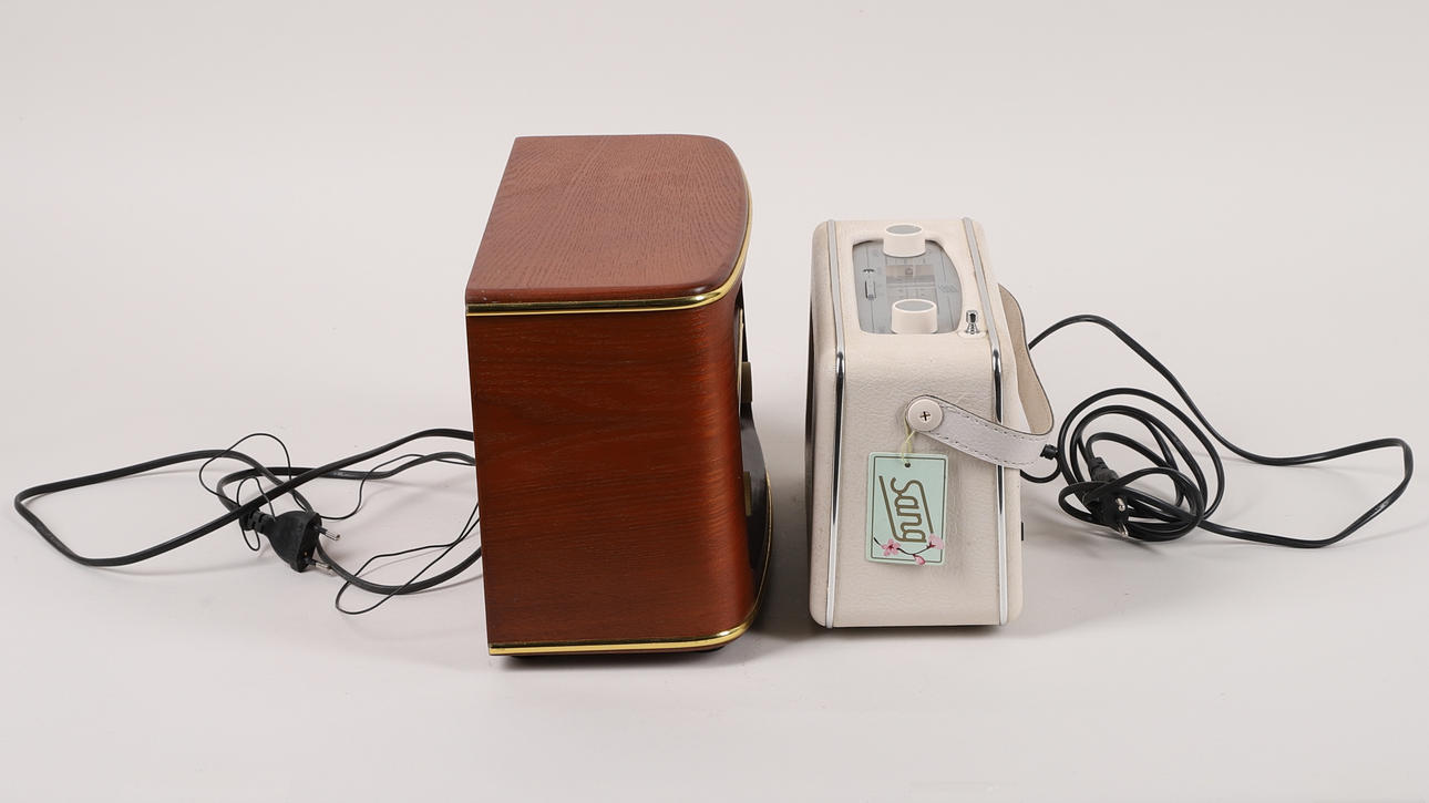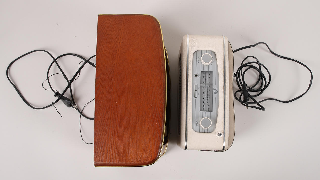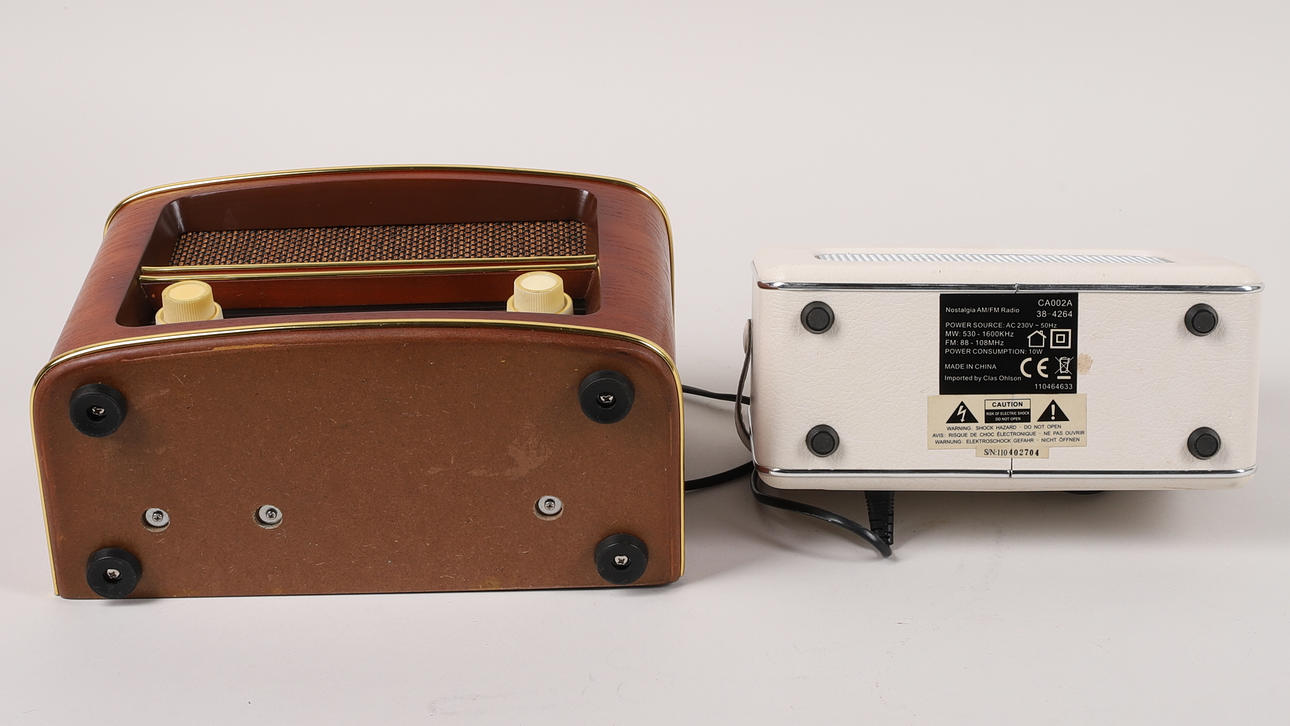 2 st radioapparater av modern tillverkning i gammal stil, sålda av Clas Ohlson, mått ca 31 x 20.5 x 15 cm, samt ca 25 x 17 x 11 cm.