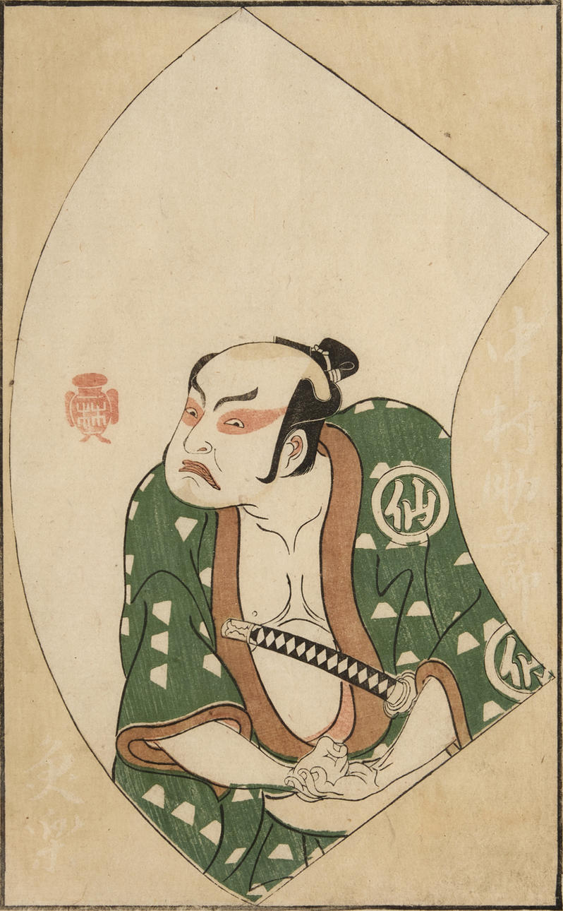 Ippitsusay Buncho, the actor Tomizawa Hanzaburô resp. Katsukawa Shunsho, ur Ehon butai/picture book of kabuki fan prints. Bladstorlek ca 27x16,5cm