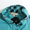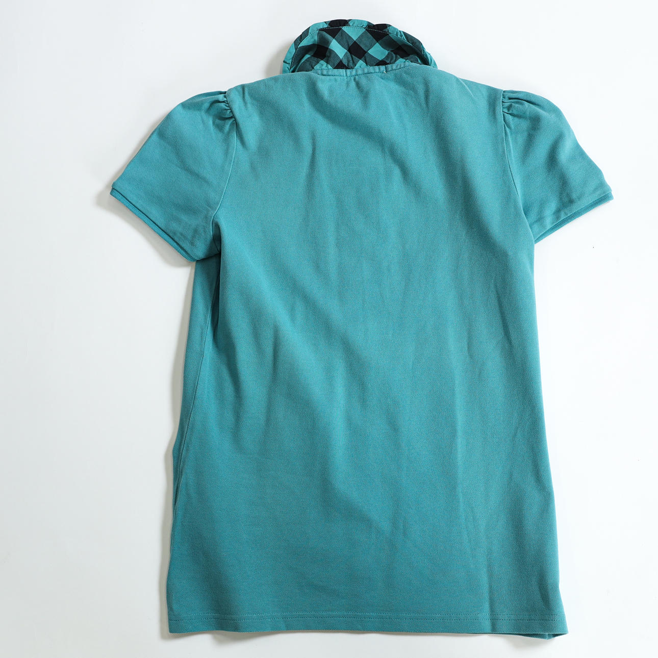 Pike i turkoseblå bomull- och elastanemix. Krage i Burberryrutigt bomullstyg. Kort ärm med rynk. Bystvidd ca 80 cm, längd ca 58 cm.