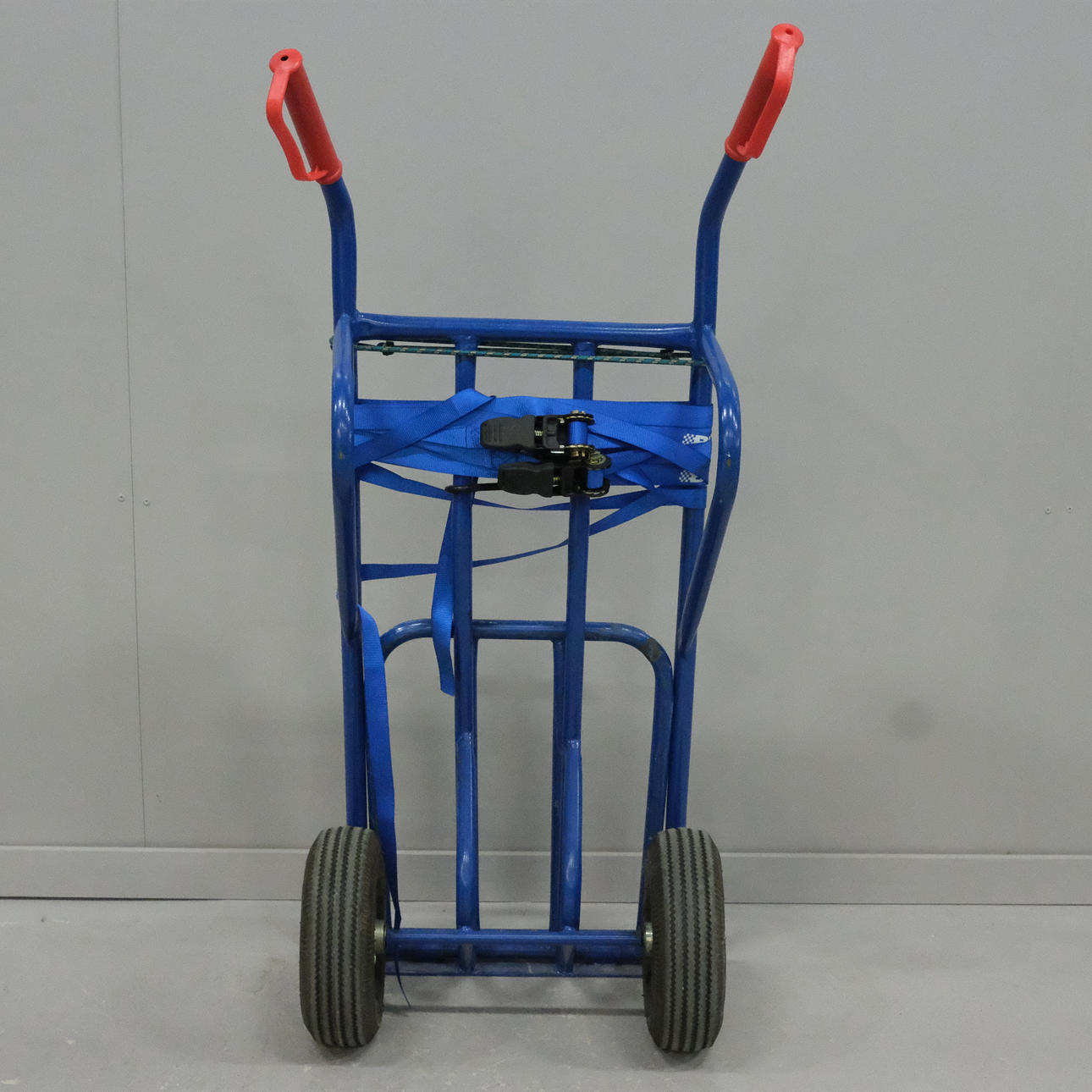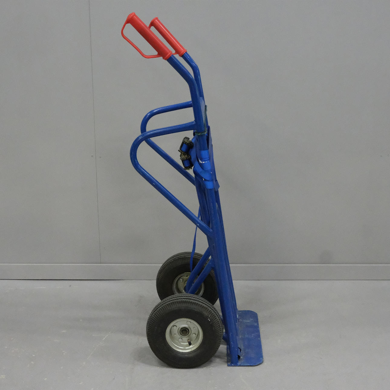 Blålackerad. Röda handtag. Medföljande två spännband. Höjd: ca 114 cm.