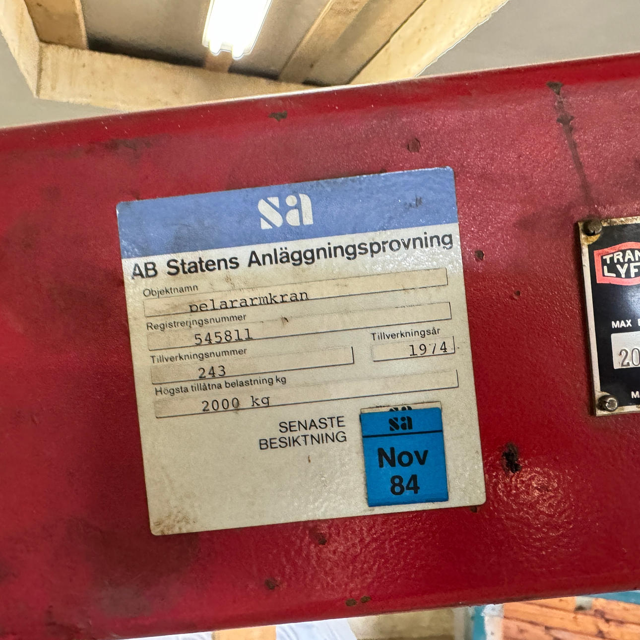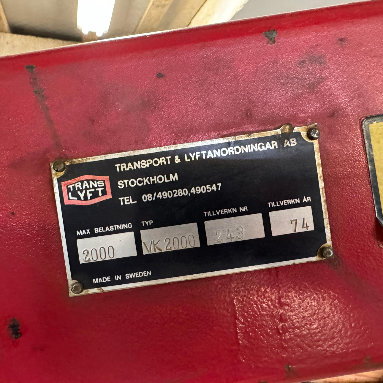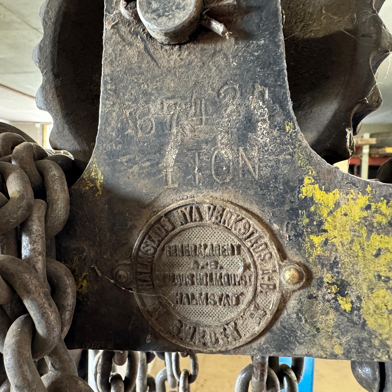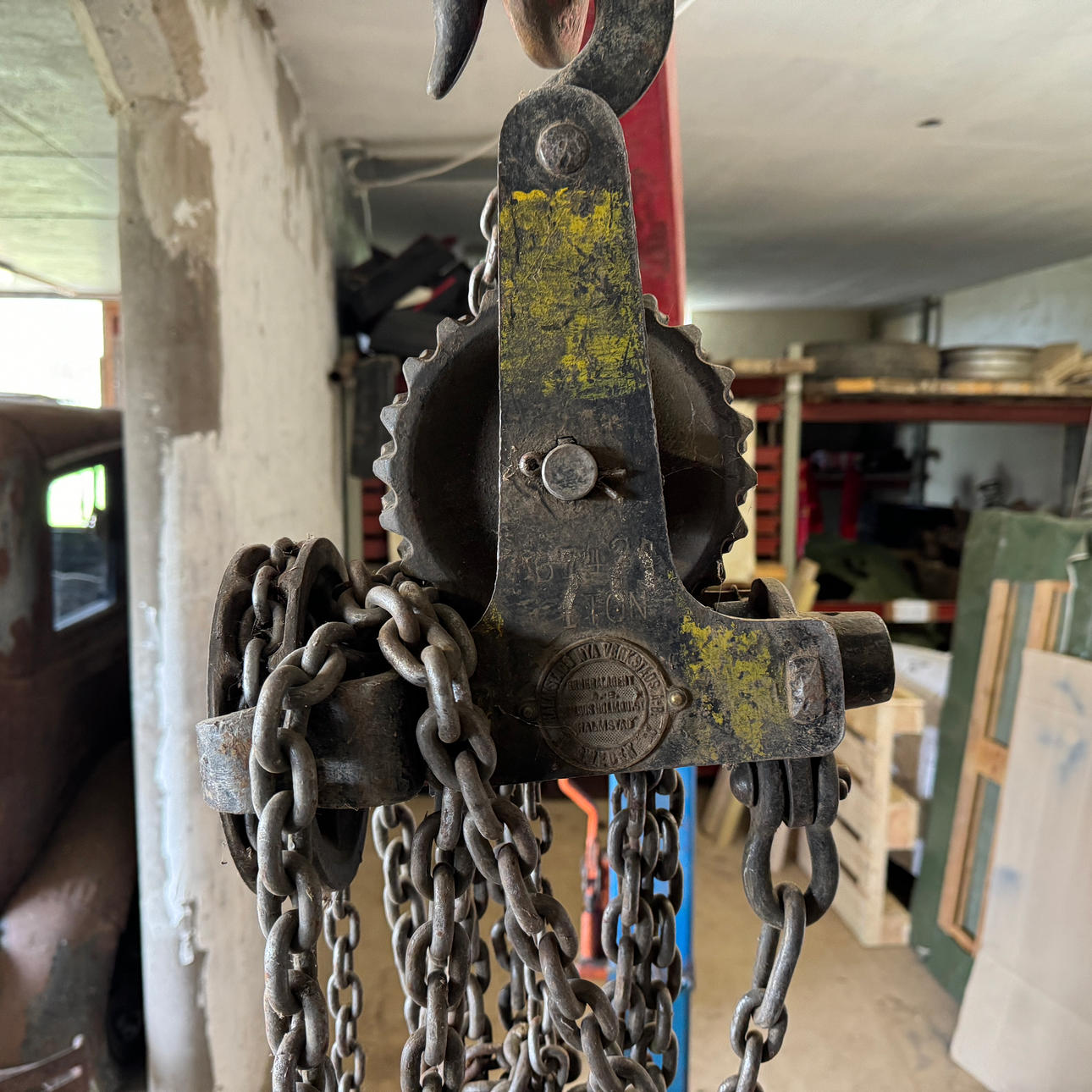 Motorlyft med talja. Talja och lyft har olika max tillåtna vikt.