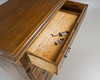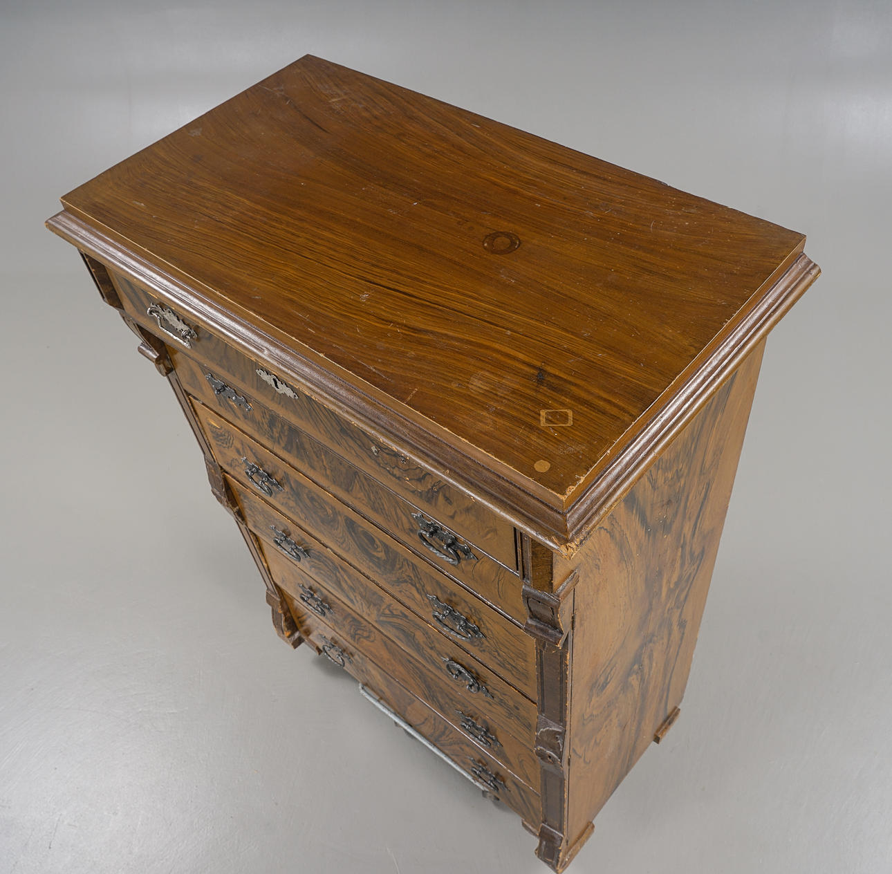 6 lådor, ådringsmålad, kannelerad och skuren dekor.
