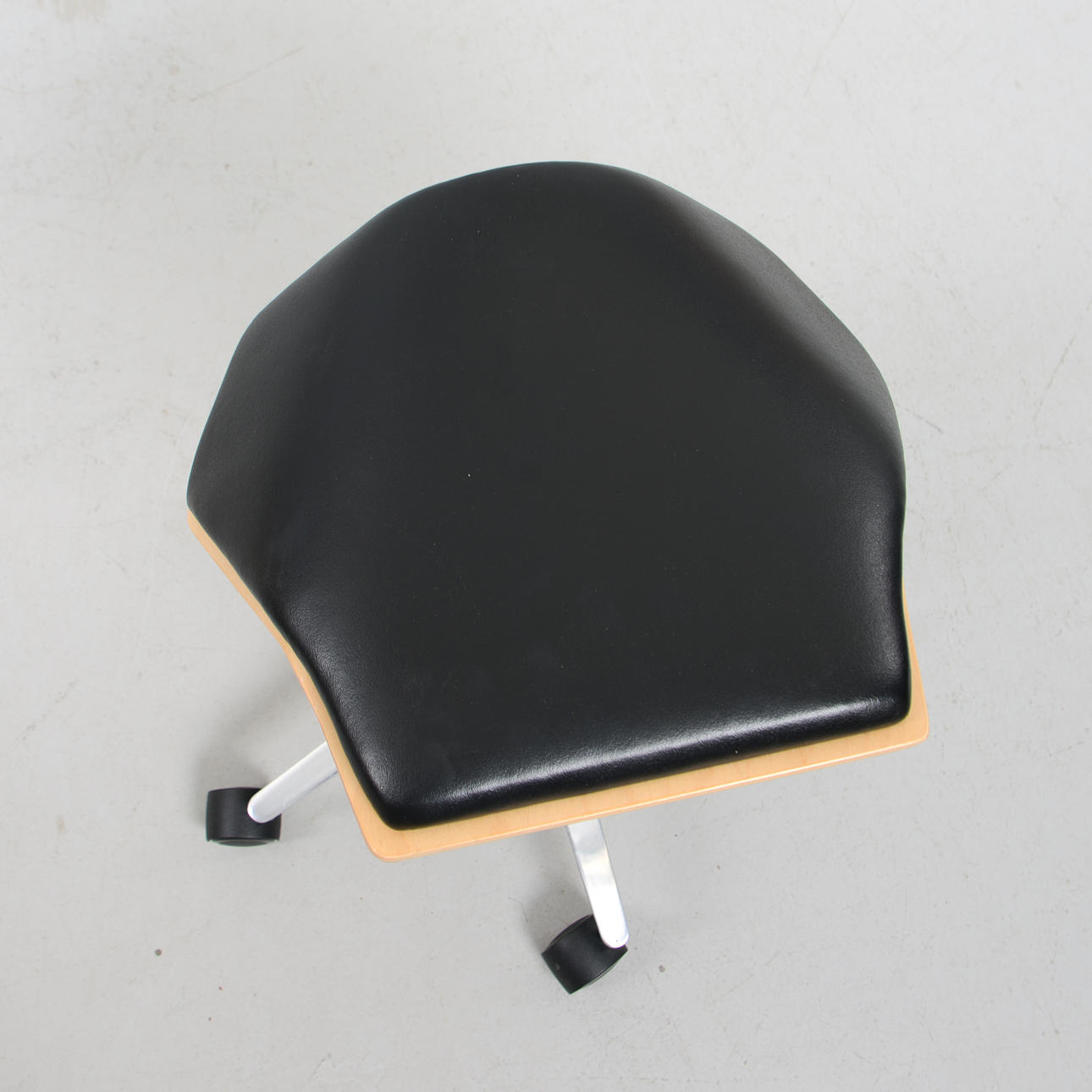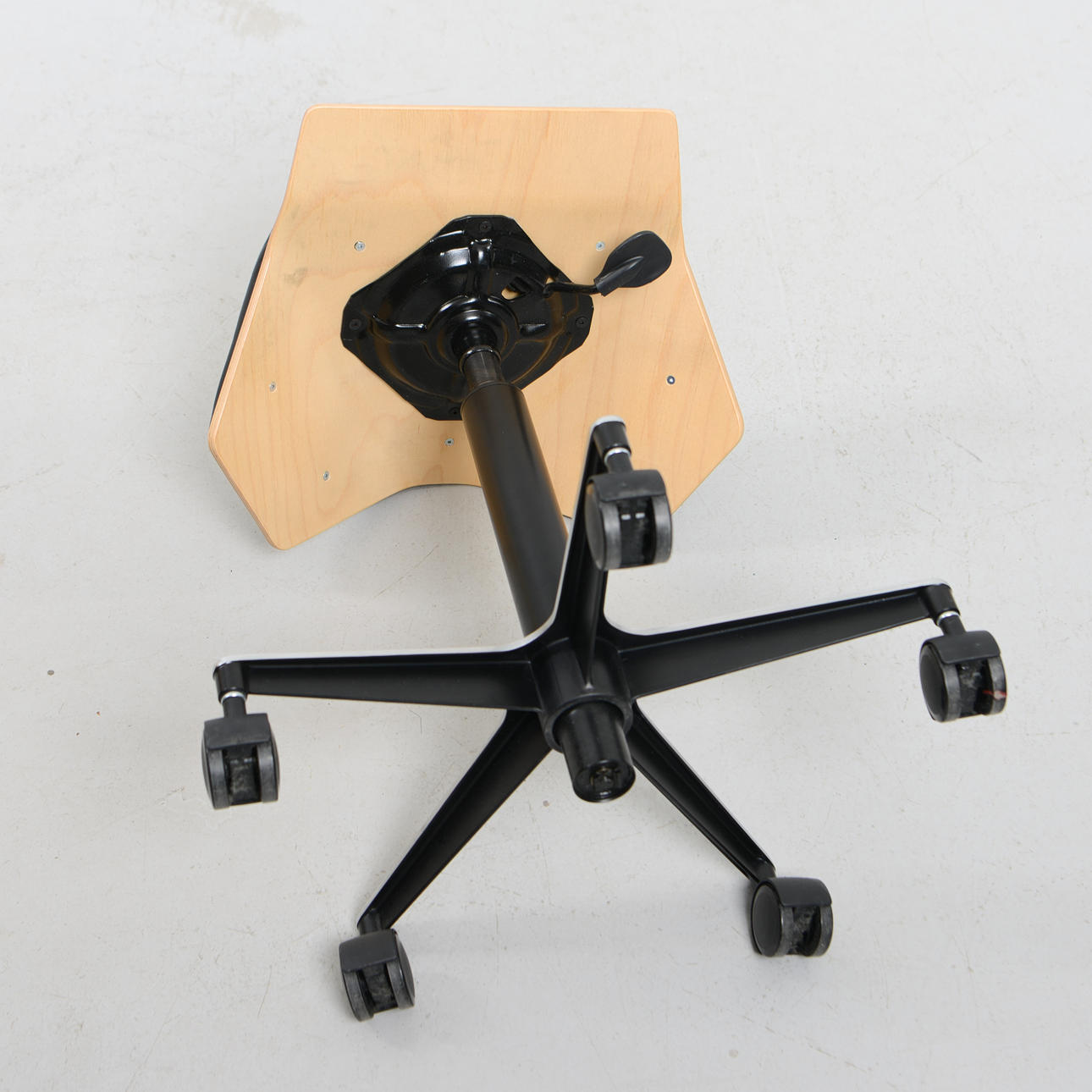 Formpressad sits i björk. Ställbar höjd. Hjultrissor. 54.5 cm som lägst och 80 cm som högst.