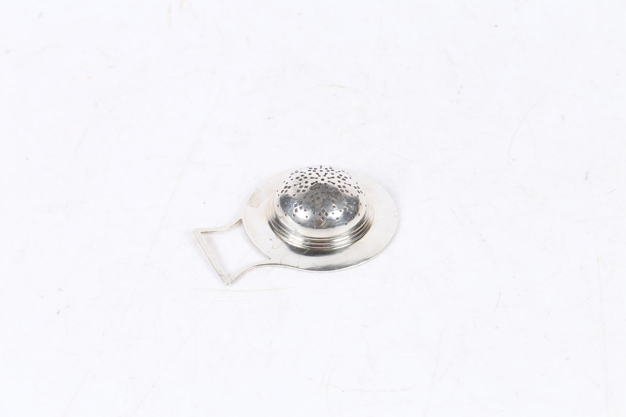 Birmingham 190, tillverkare T H Hazlewood & Co. med kantigt genomborrat handtag och cirkulär genomborrad sil omgiven av en rullgjuten kant, 9,5 cm lång, 7,5 cm diameter, 1 oz.