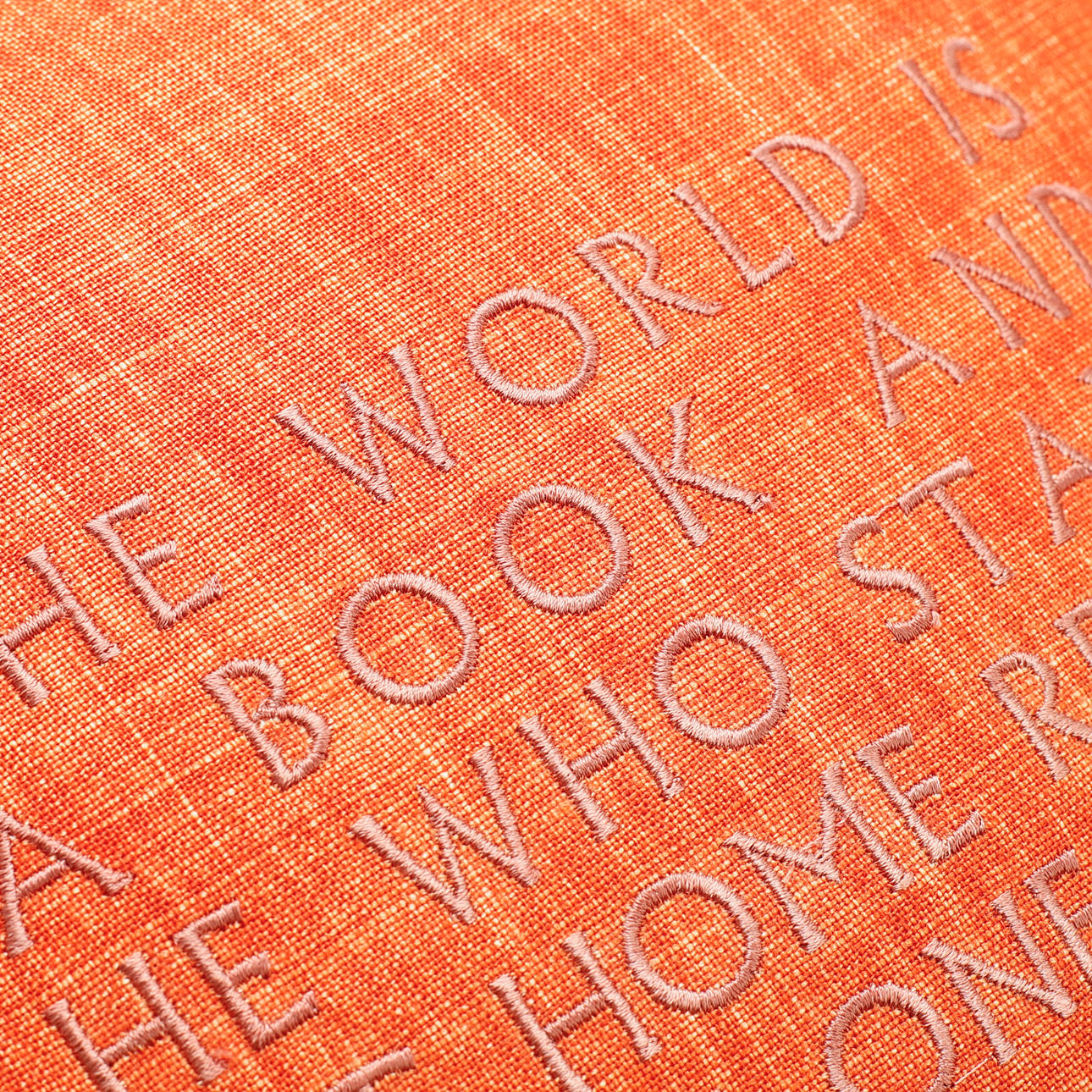Kudde "The world is a book", linnetyg, ca 36 x 36 cm. Kudde med mönstret "Anakreon" av Josef Frank, linnetyg, etikettmärkt, ca 46 x 46 cm. Innerkuddar fyllda med dun.