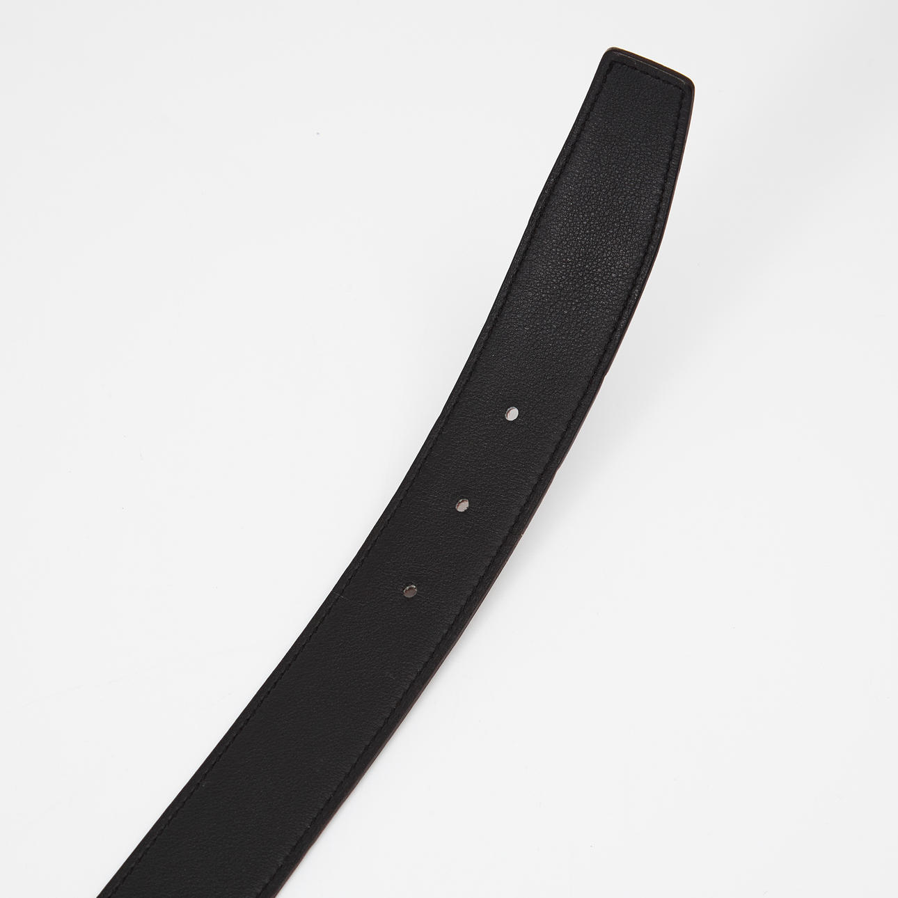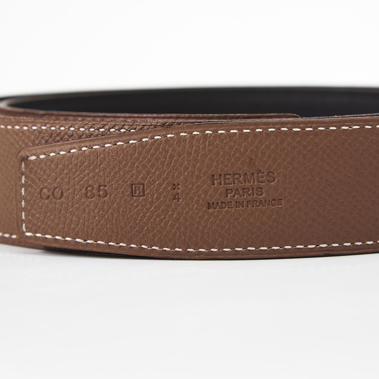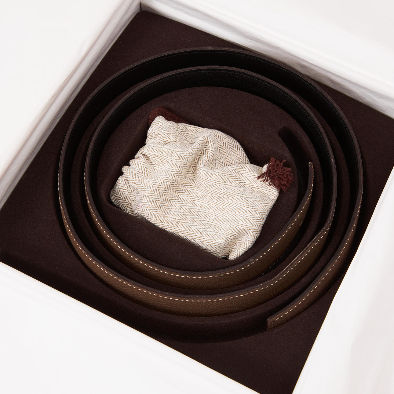 i svart / ljusbrun, ètoupe/black läder med H-spänne, totallängd ca 98 cm, bredd ca 3 cm. I originalbox, inköpt NK 2014.
