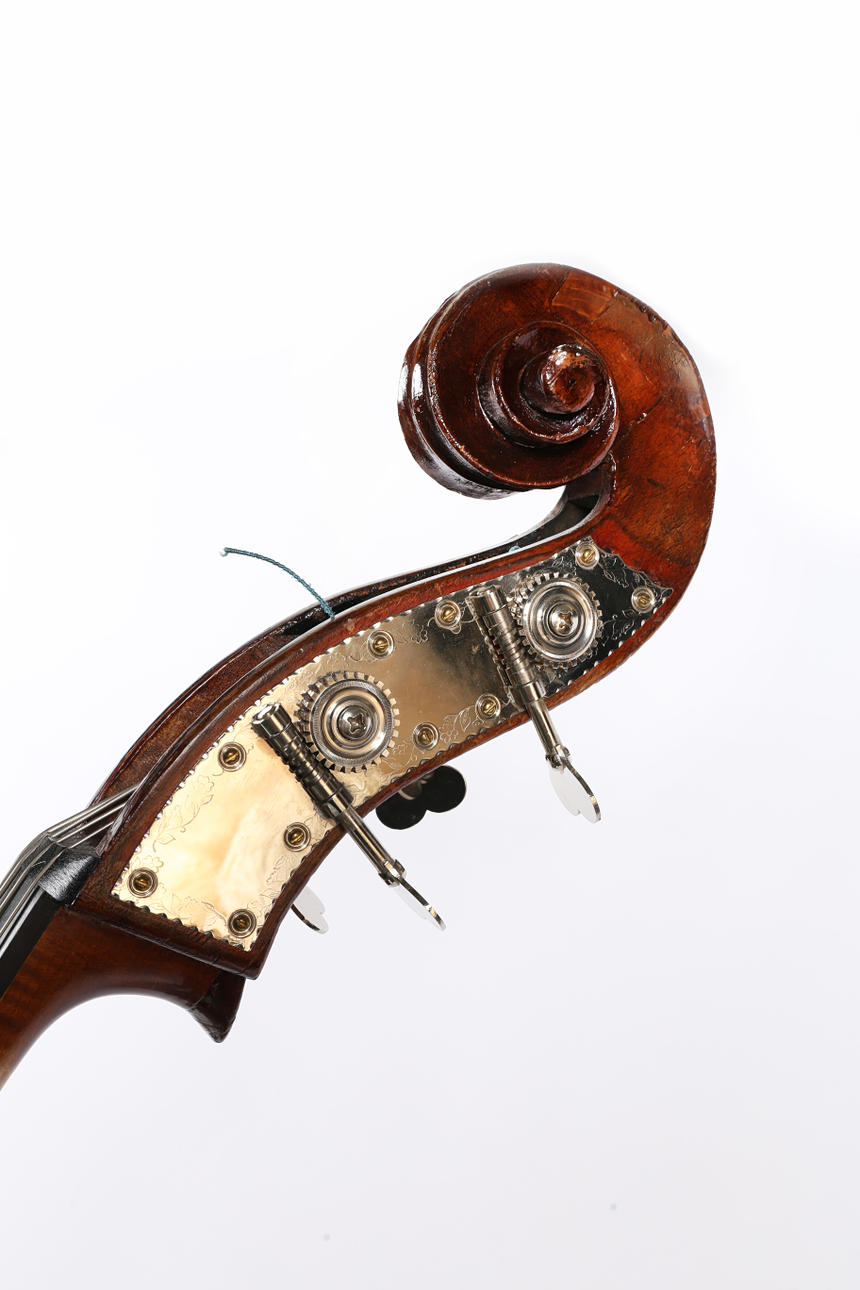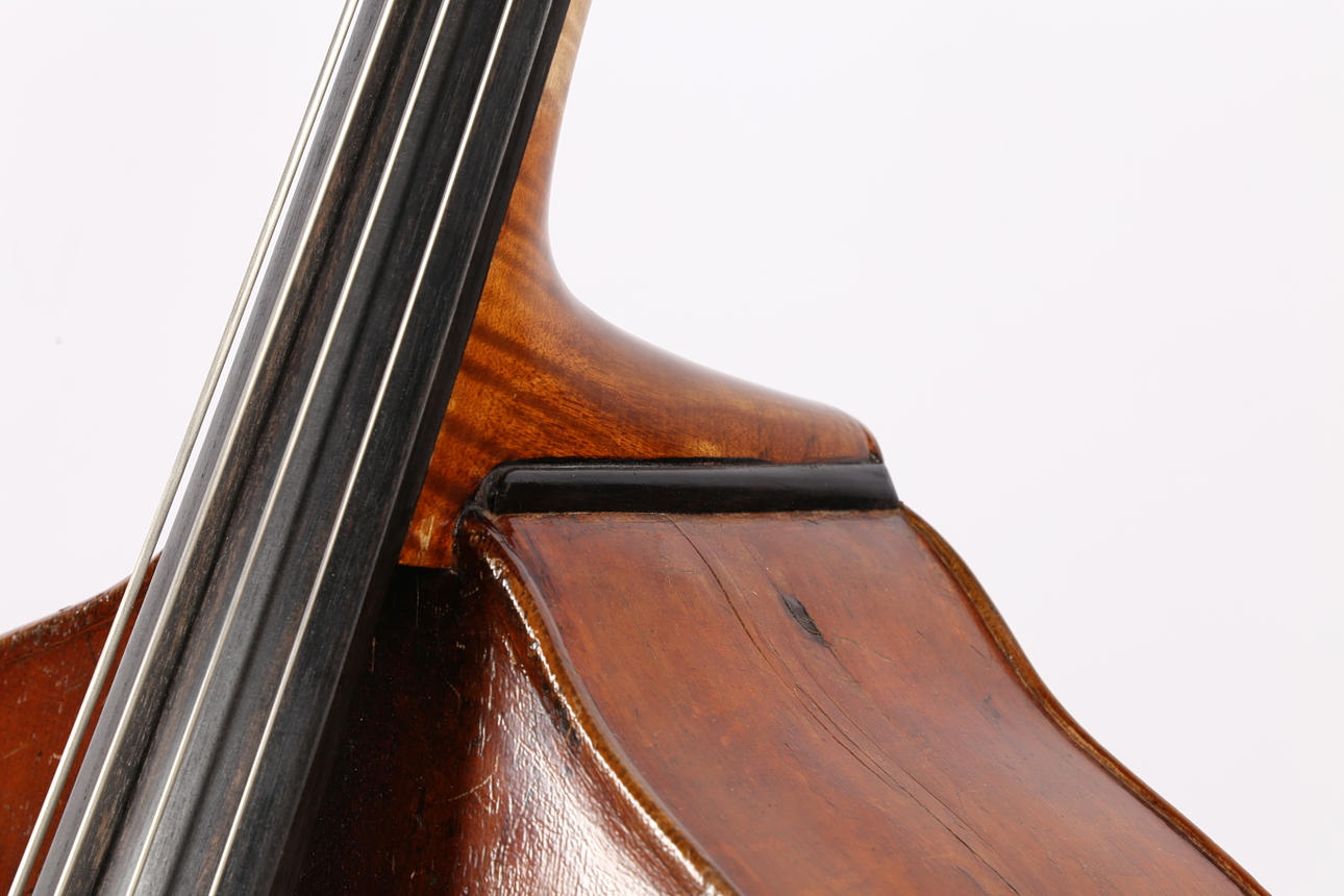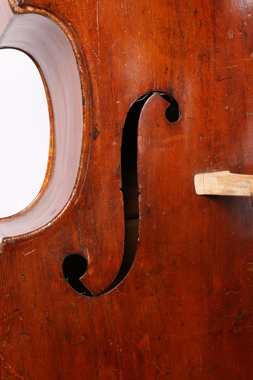 Tillverkad i Mittenwald, den tyska kontrabasen med en tvådelad lönnrygg och bokrulle, ca. 180cm höjd.