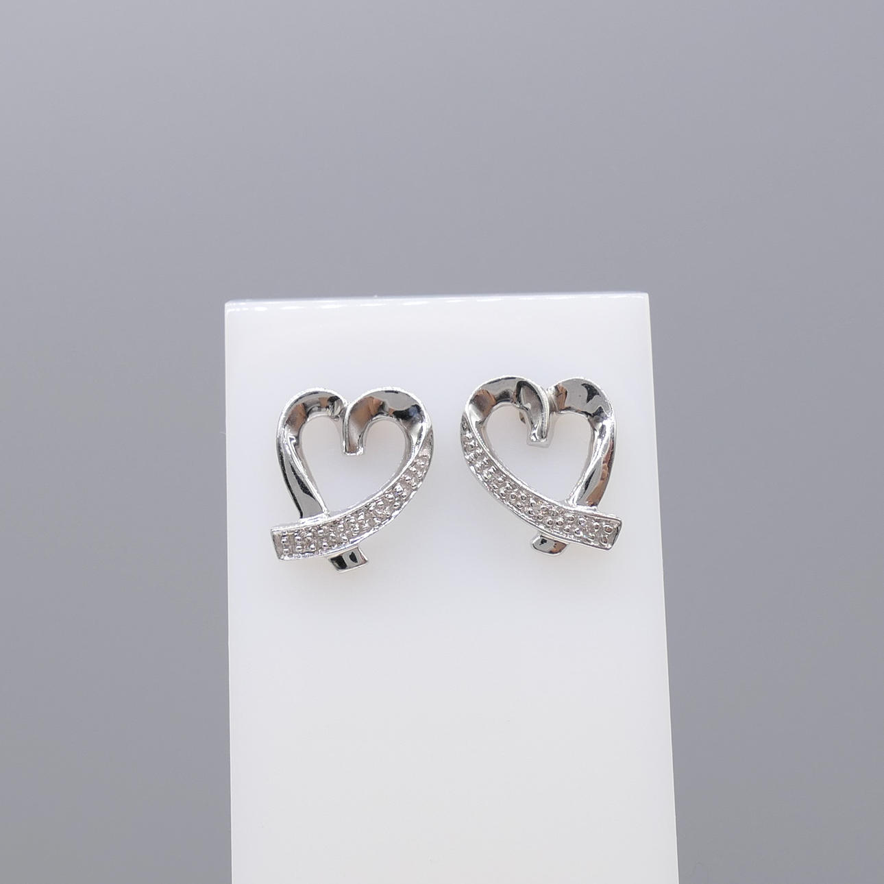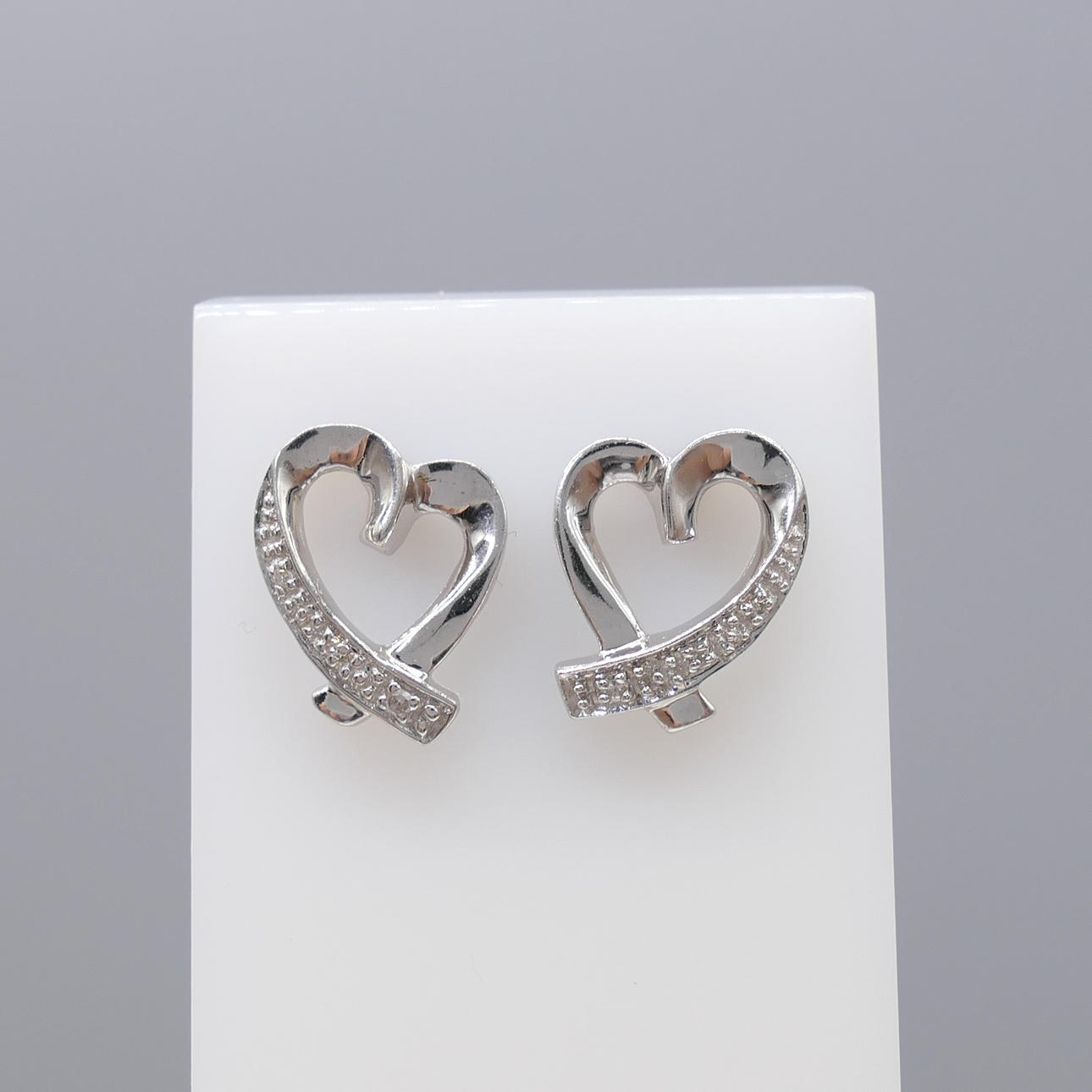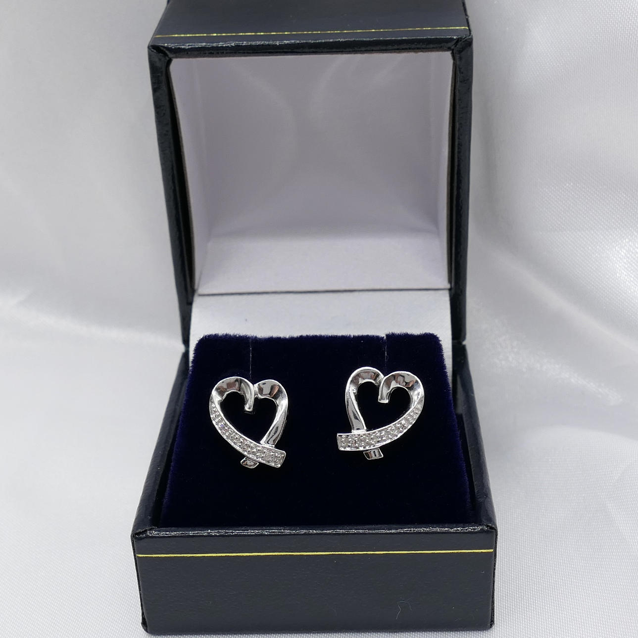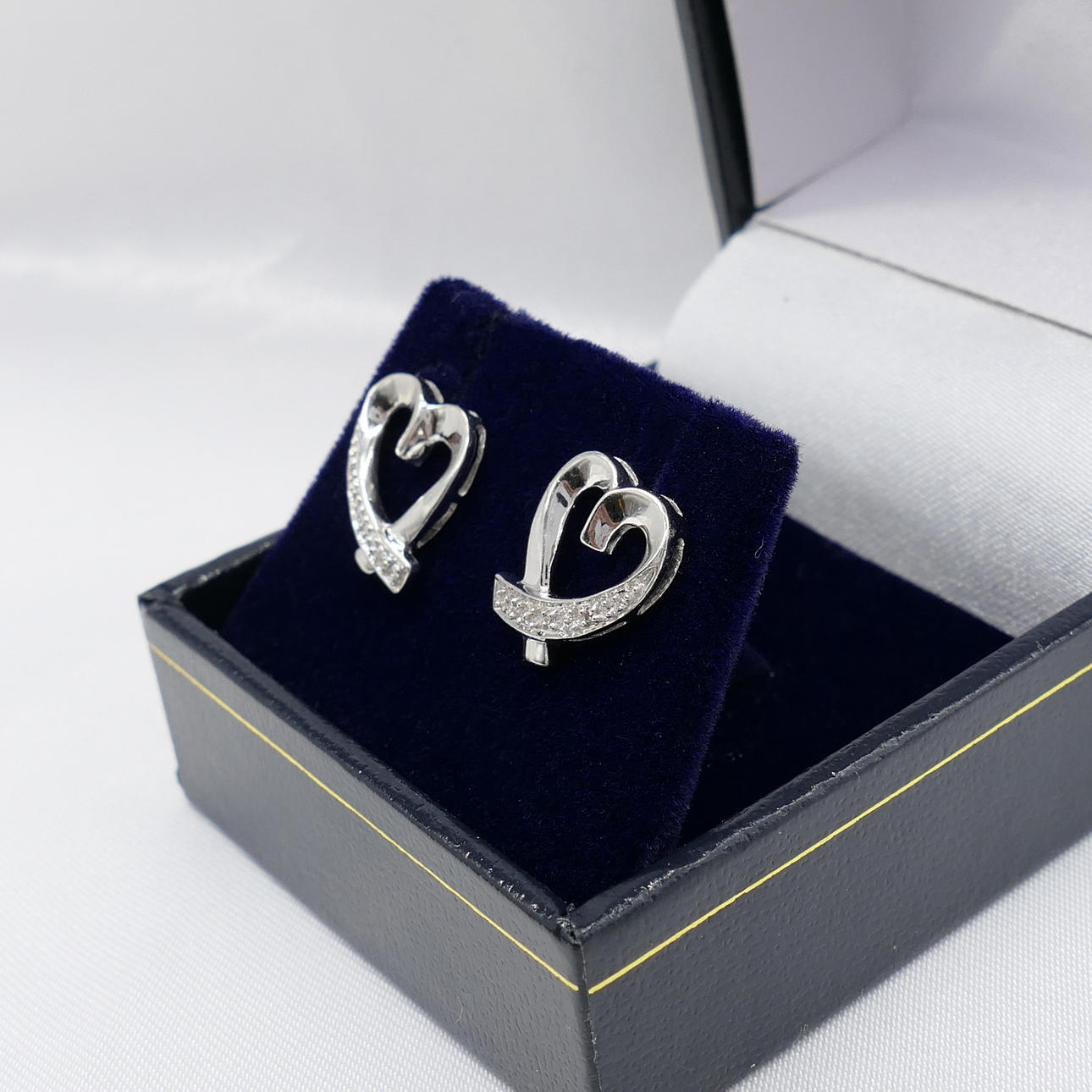 Ett par hjärtformade diamantörhängen i vitguld, med presentask.