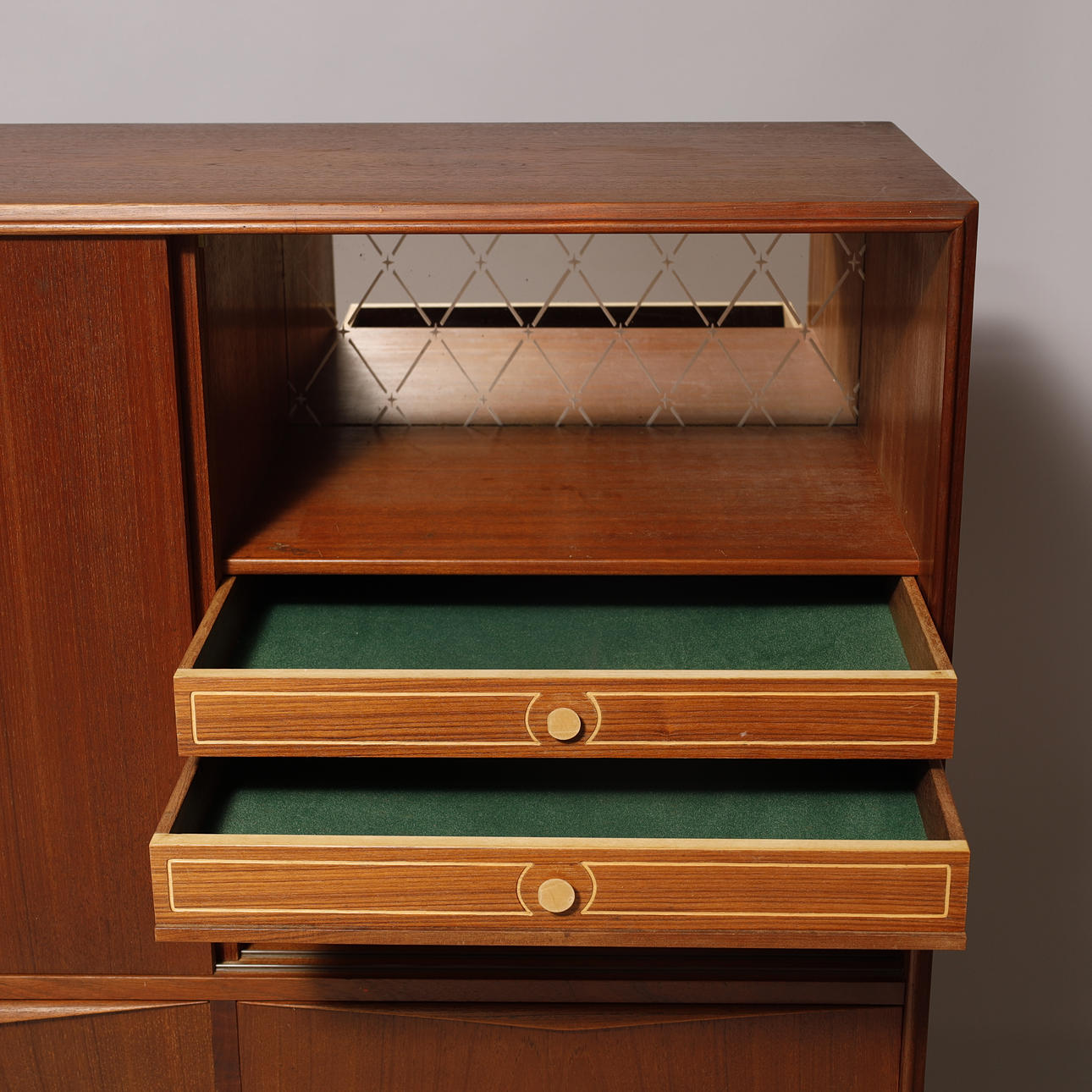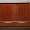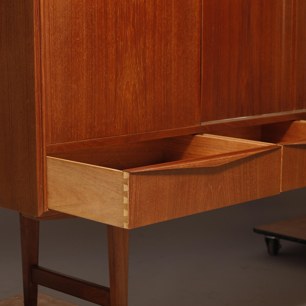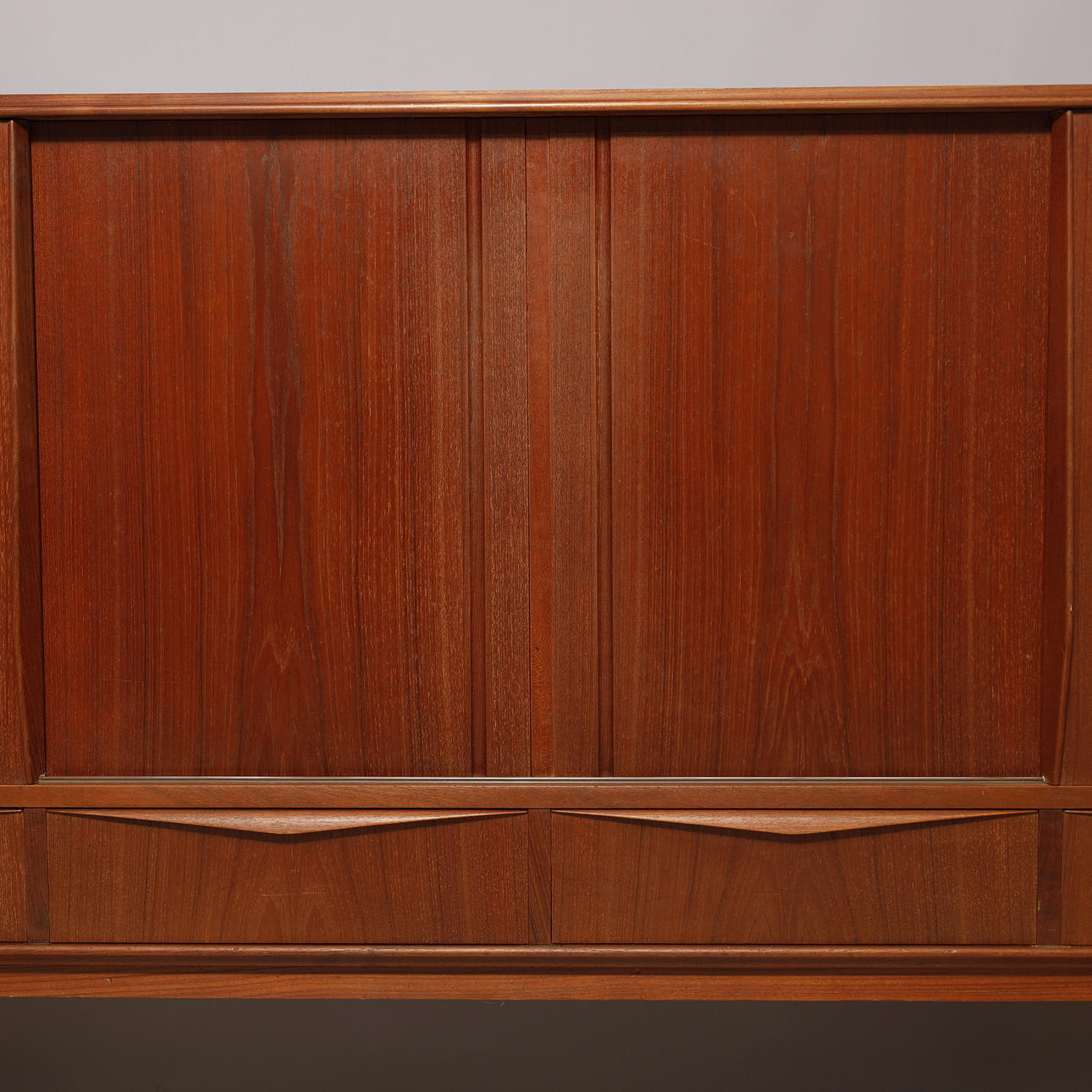 Skänk av fanerad teak, fram med fyra skjutdörrar bakom vilka hyllor, nedre fyra lådor. Höjd 112 cm. Längd 196 cm. Djup 45 cm.