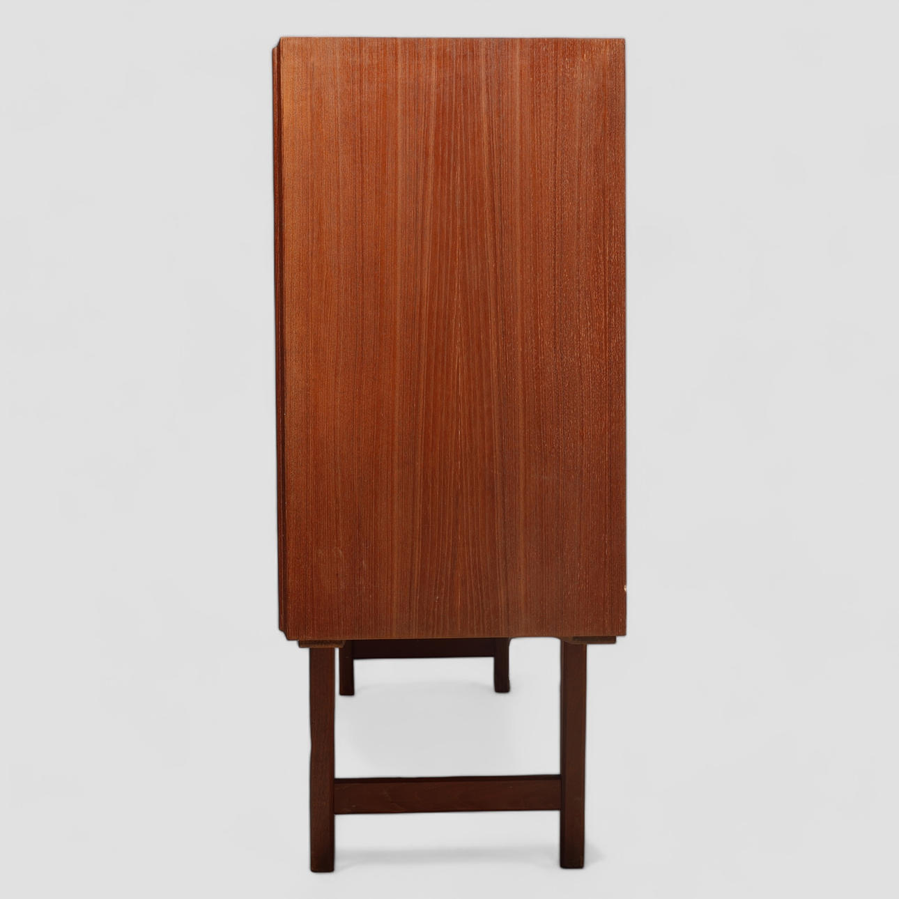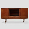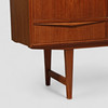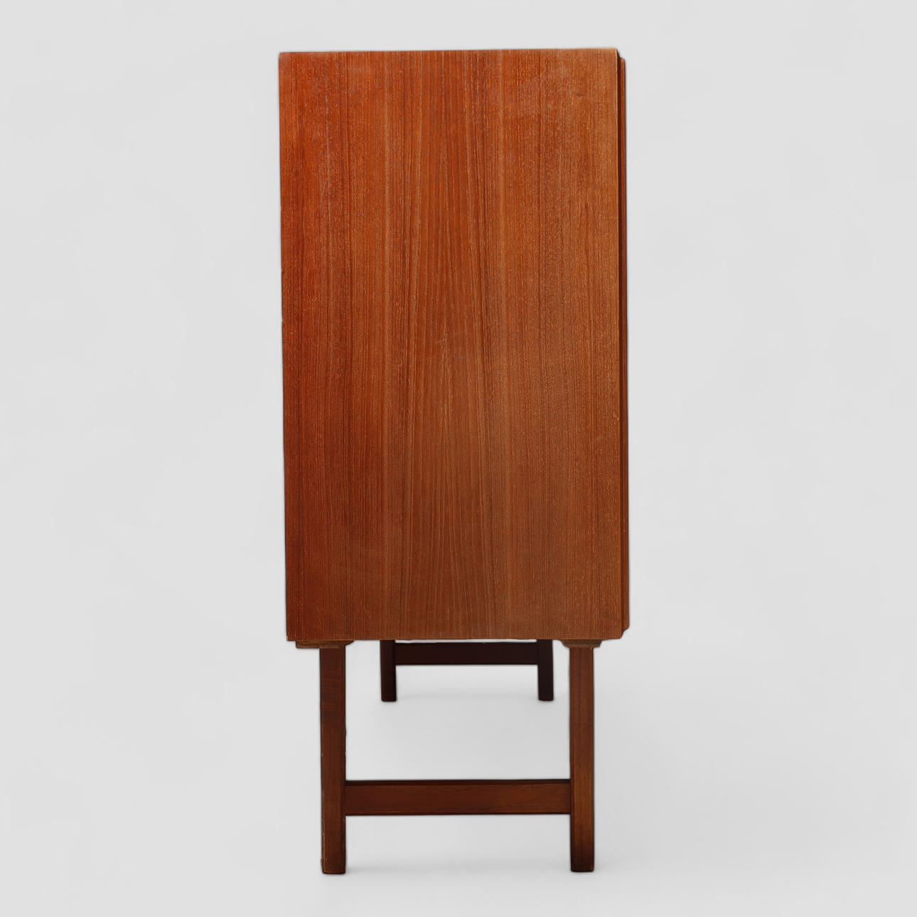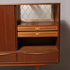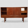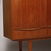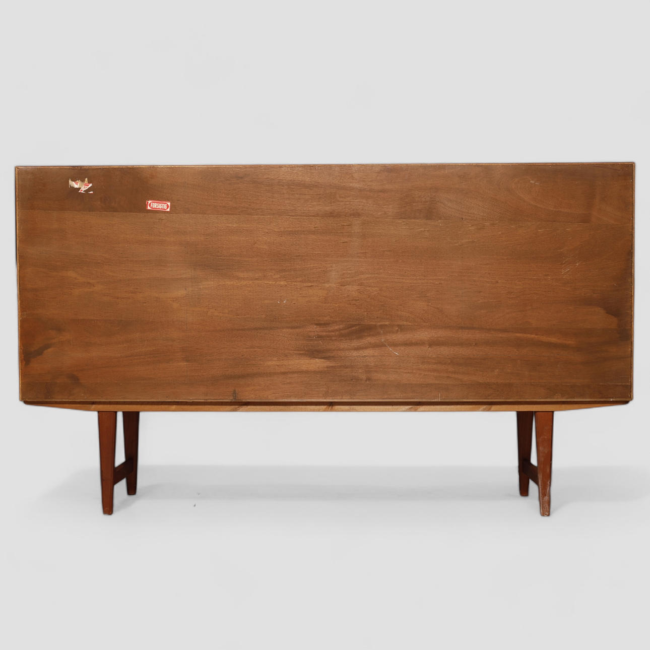 Skänk av fanerad teak, fram med fyra skjutdörrar bakom vilka hyllor, nedre fyra lådor. Höjd 112 cm. Längd 196 cm. Djup 45 cm.