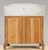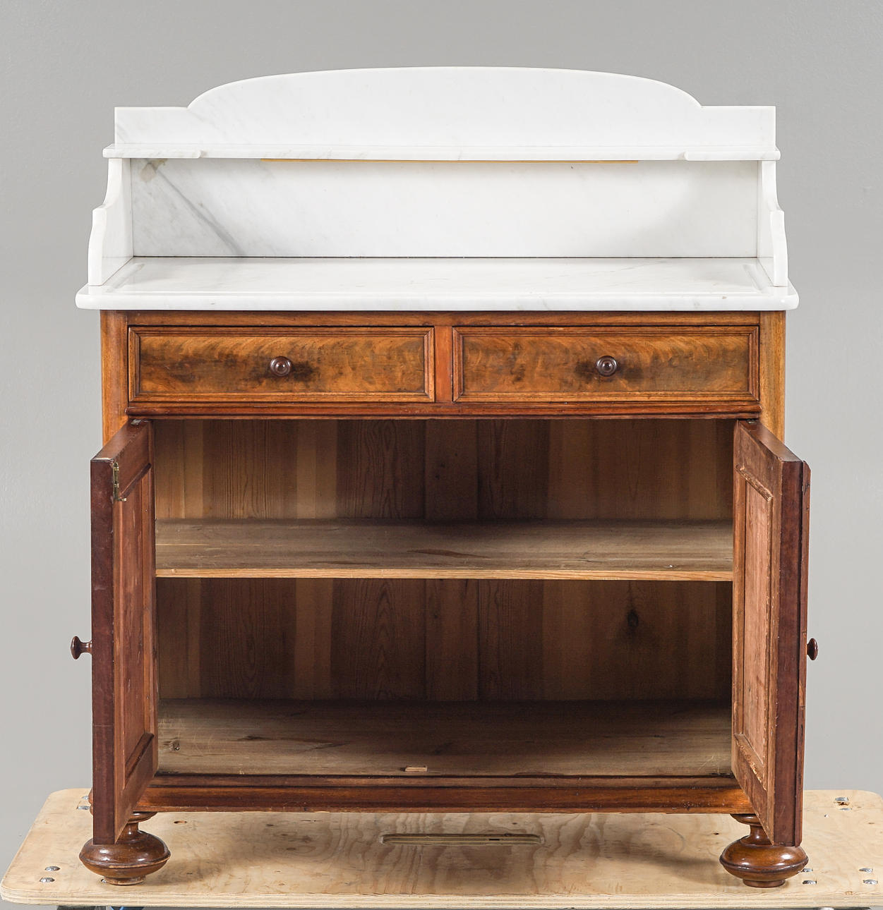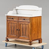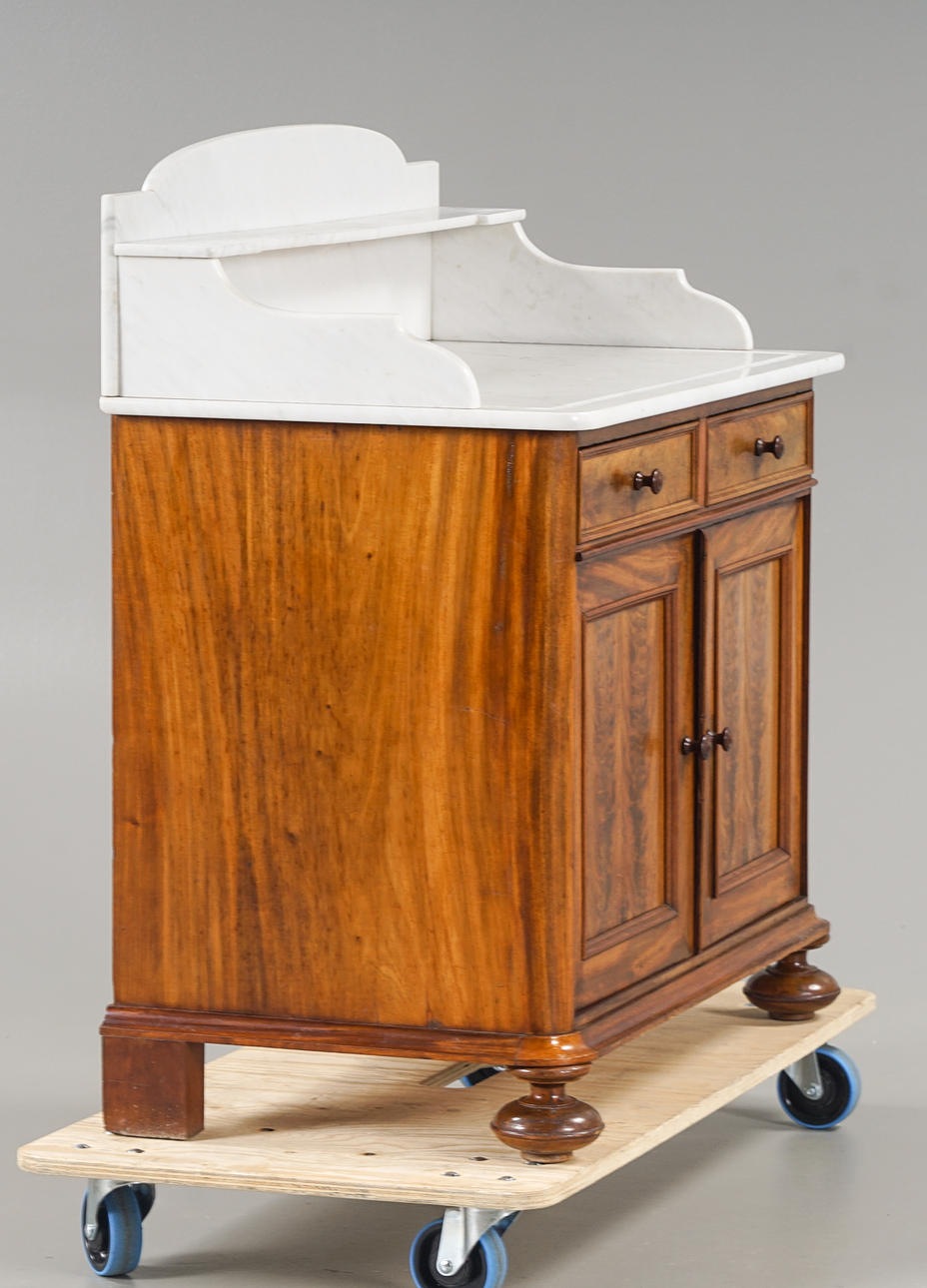 Fanerad med mahogny, uppsats i marmor. 2 lådor samt skåpdel.
