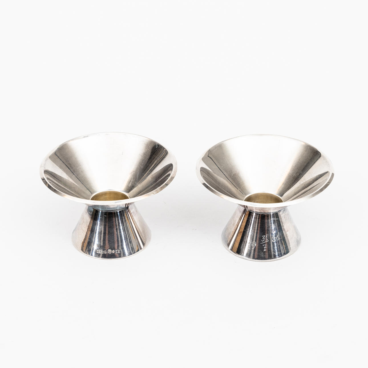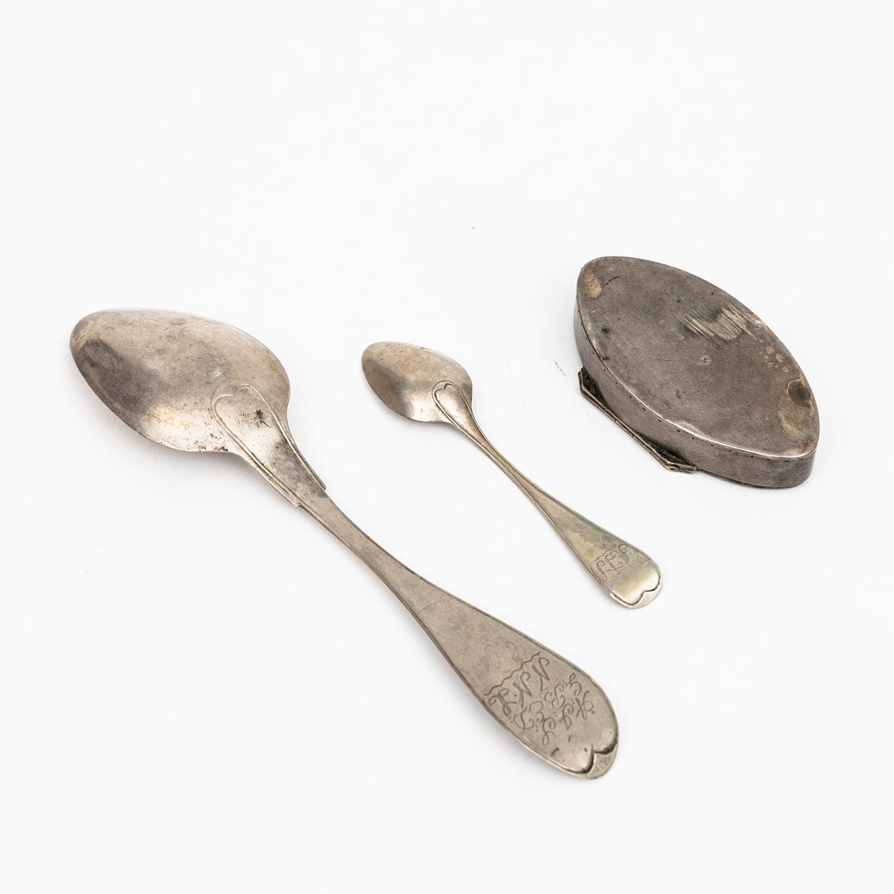 Bestående av 1 par ljusstakar (GAB), 2 skedar, del av spetsdosa, punschkopp, tesil samt 2 slaggprodukter av silver