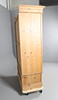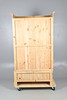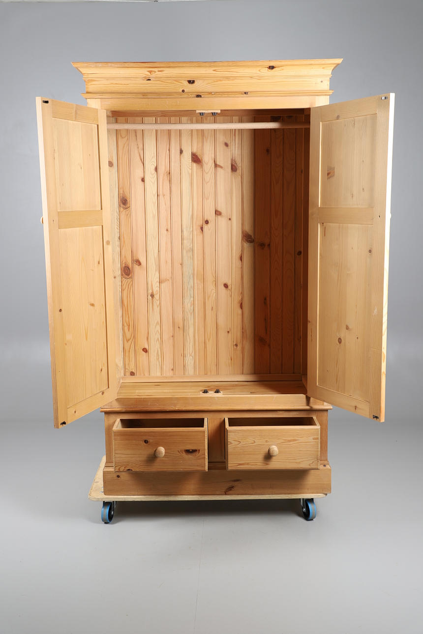 Den dubbla garderoben i furu med invändig hängande skena, avtagbar taklist och satt på en bas av två lådor. Höjd 205cm x Bredd 120cm x Djup 61cm.