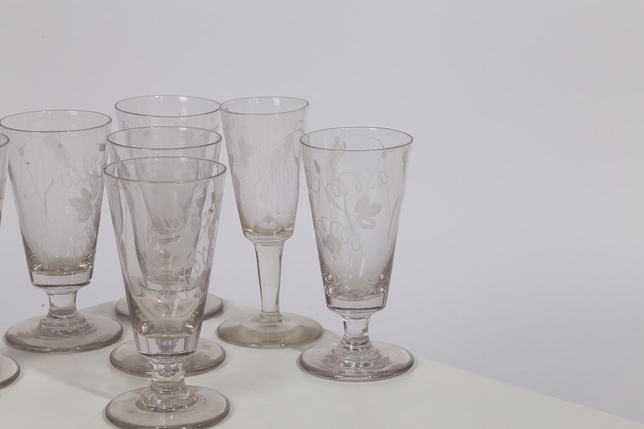 Konisk form med etsad design av en vetehöv tillsammans med ett annat georgiskt vinglas.