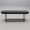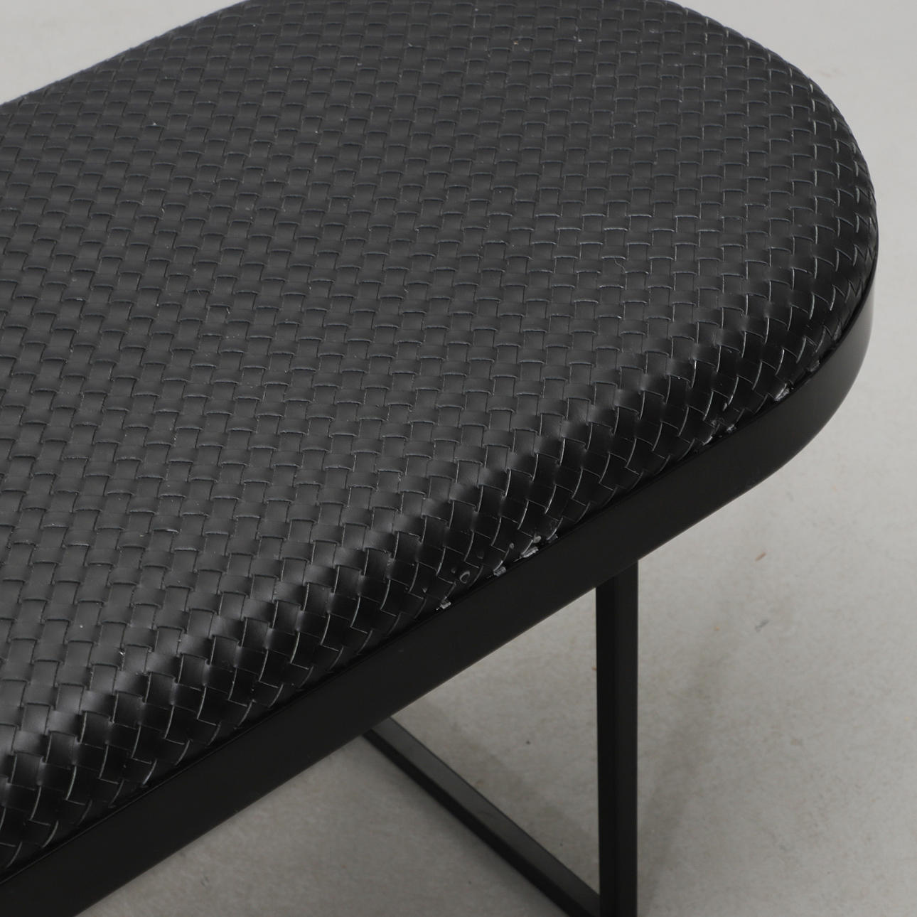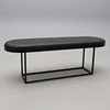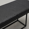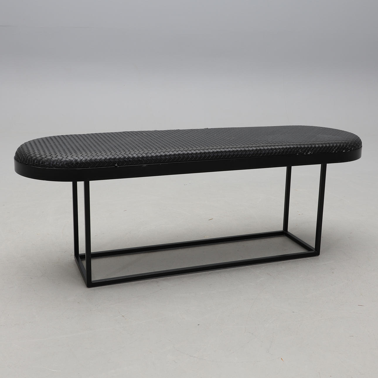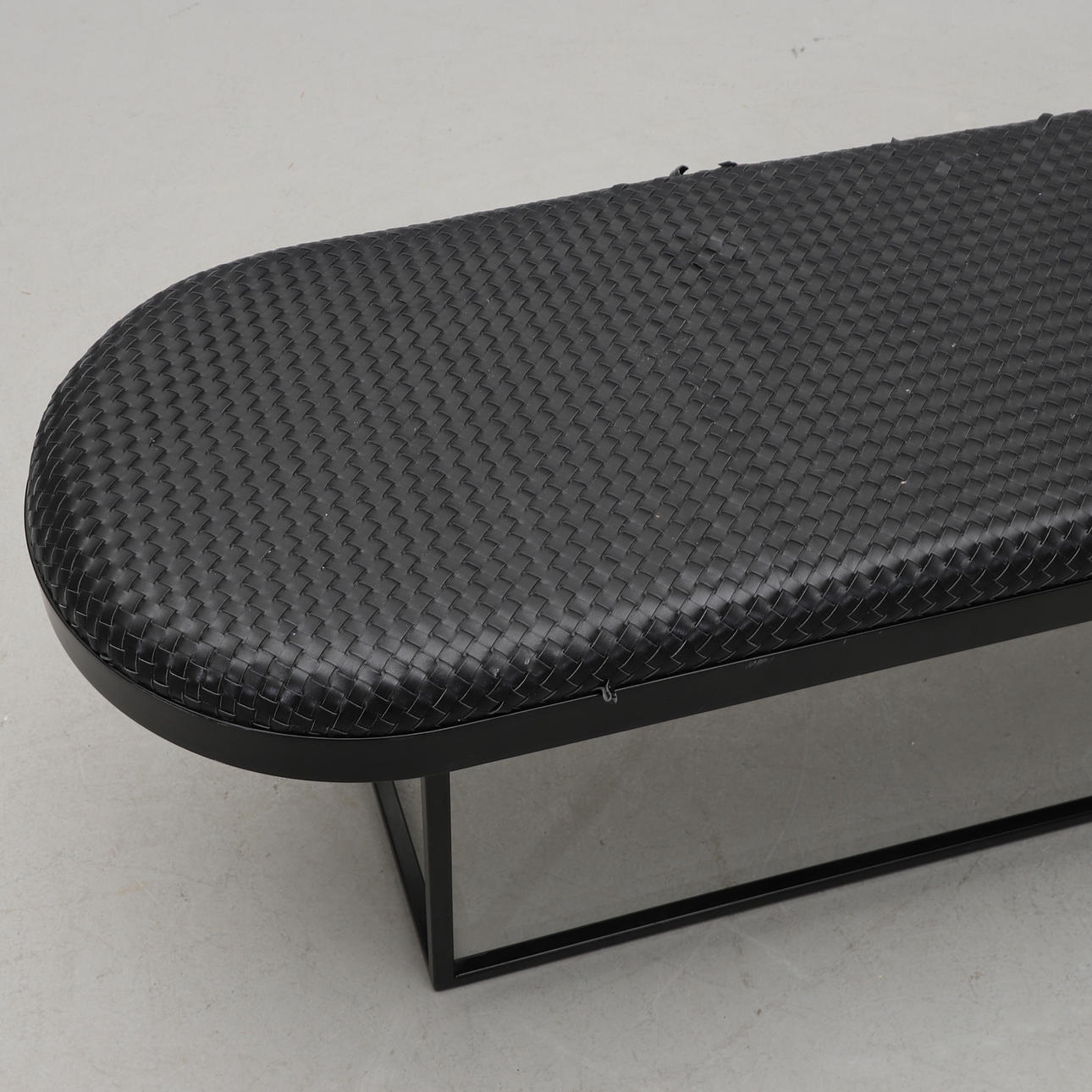 Svartlackerat metallunderrede, stoppad sits klädd med flätat svart läder. Längd 130, bredd 40, höjd 46 cm.