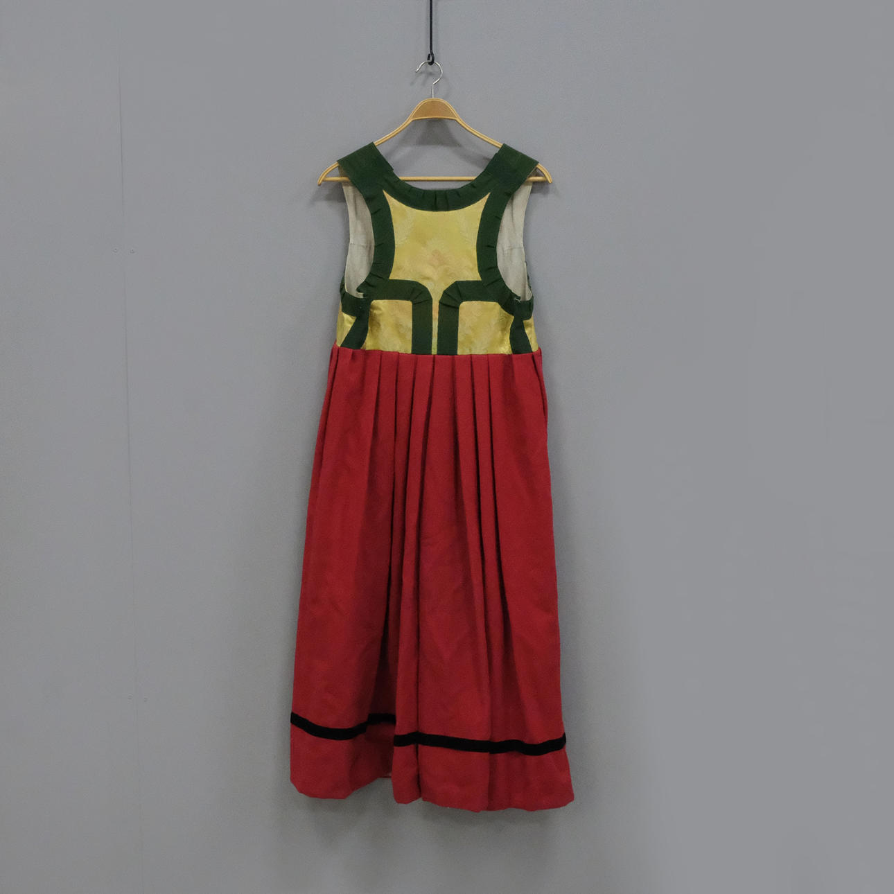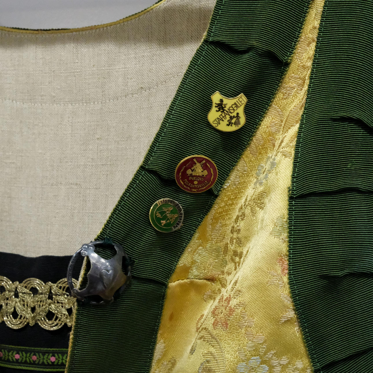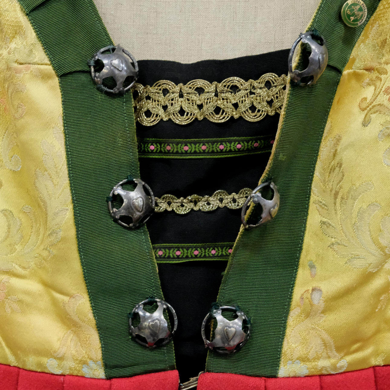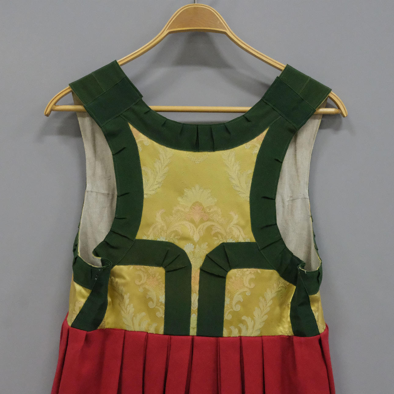 Klänning, skjorta, tre förkläden samt bälte med monogram EMJ och KAD 1953.
