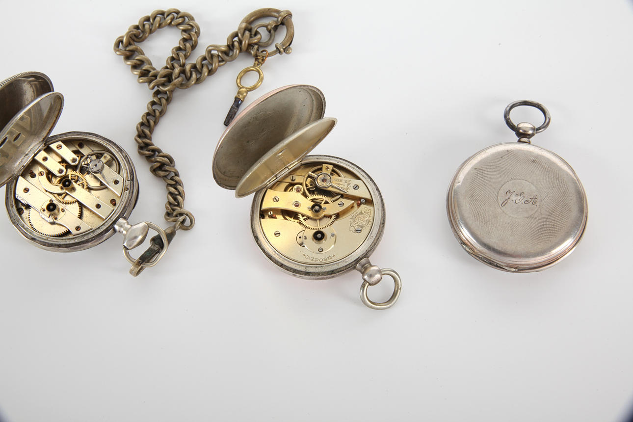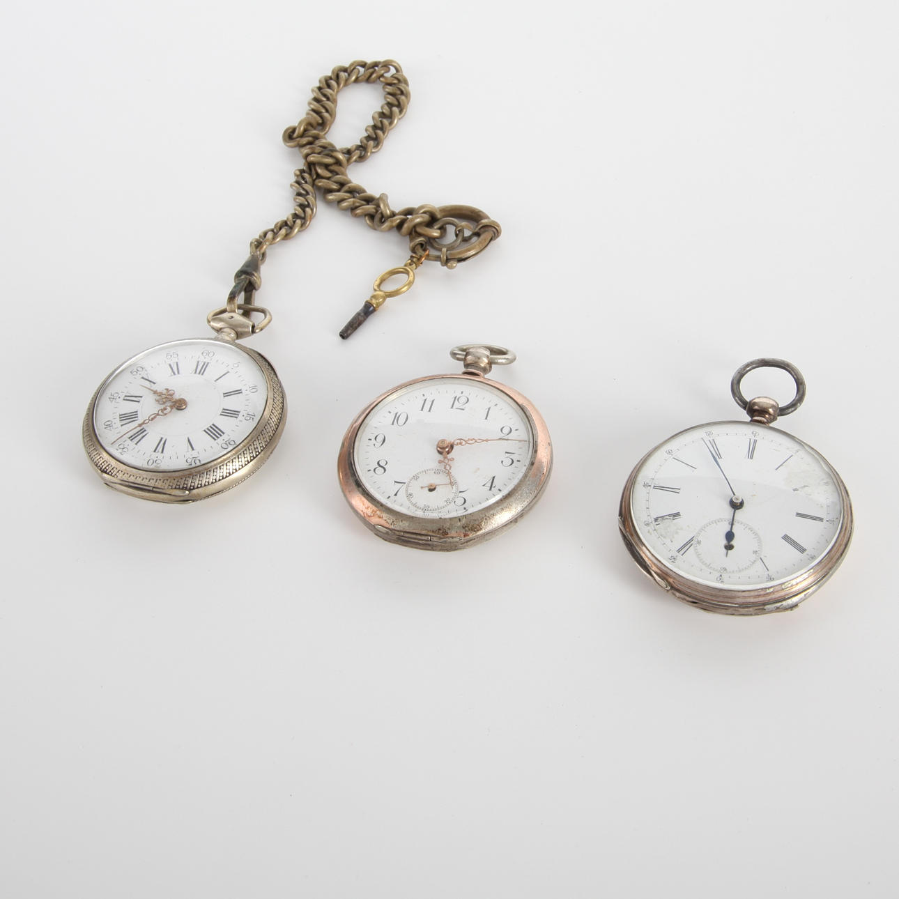 1 st Ancre Ligne Droite 15 rubis, nyckeldragare. Baksida med siseleringar och gravering “J.E.A.”. Yttre boett delvis förgylld och i silver märkt 0,800, no. 38608. Inre boett i vitmetall märkt Ancre Ligne Droite 15 rubis, no. 38608, cuivre.