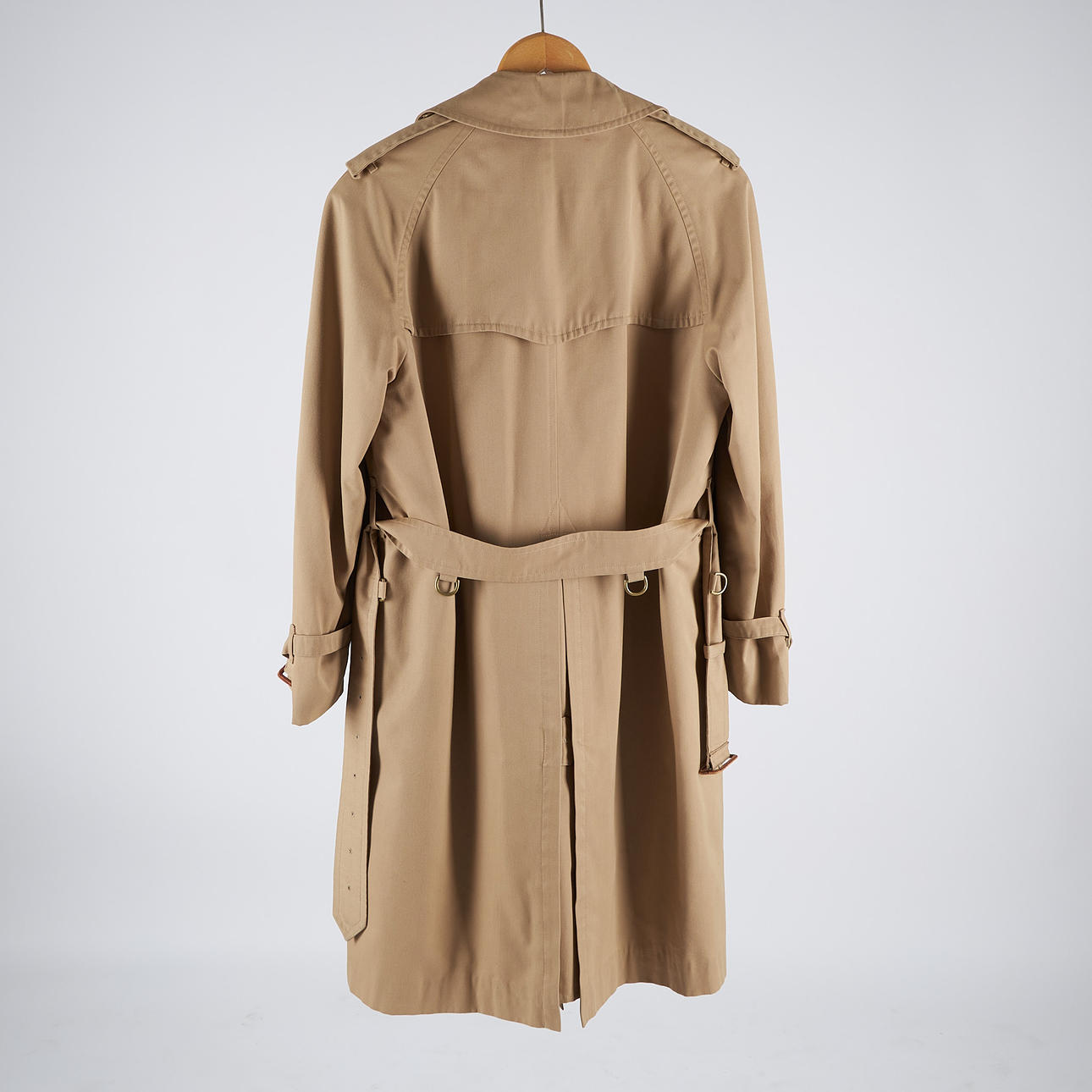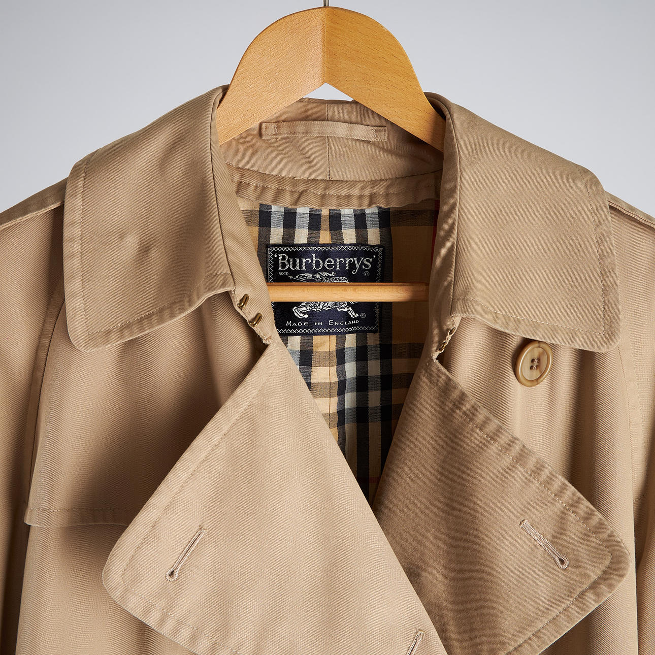 Axelbredd 45 cm, ärmläng 39 cm, rygglängd 110 cm. Löstagbart innerfoder, märkt Burberry Made in England.