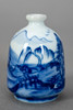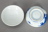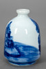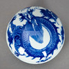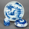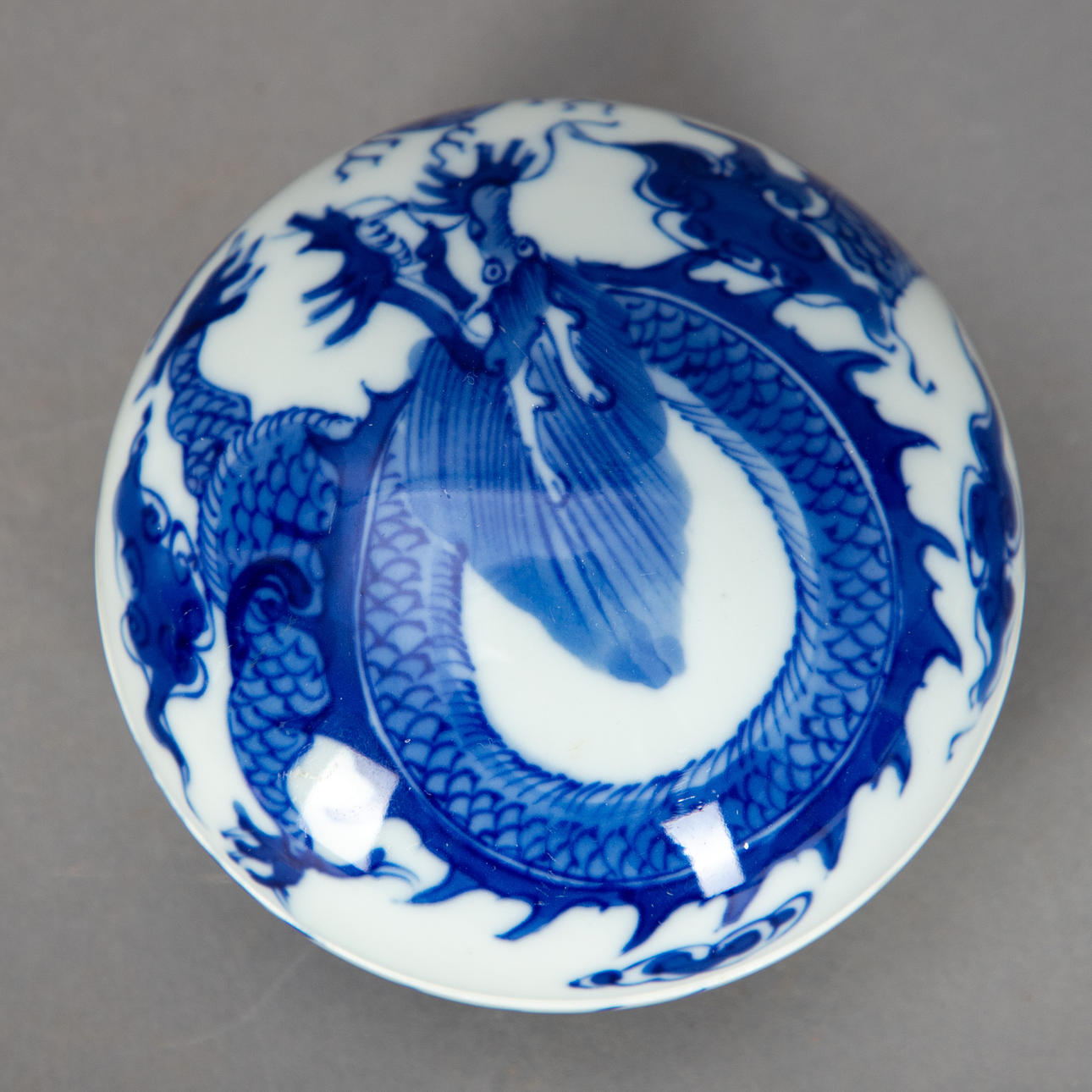 Stengods, underglasyrblå målning. 3-delad lockbox med drakdekoration, dubbel ringstämpel, diameter ca. 8 cm; Snusflaska/luktflaska, h. ca. 6 cm; liten platt skål, dubbelt ringmärke, diameter ca. 13,5 cm.