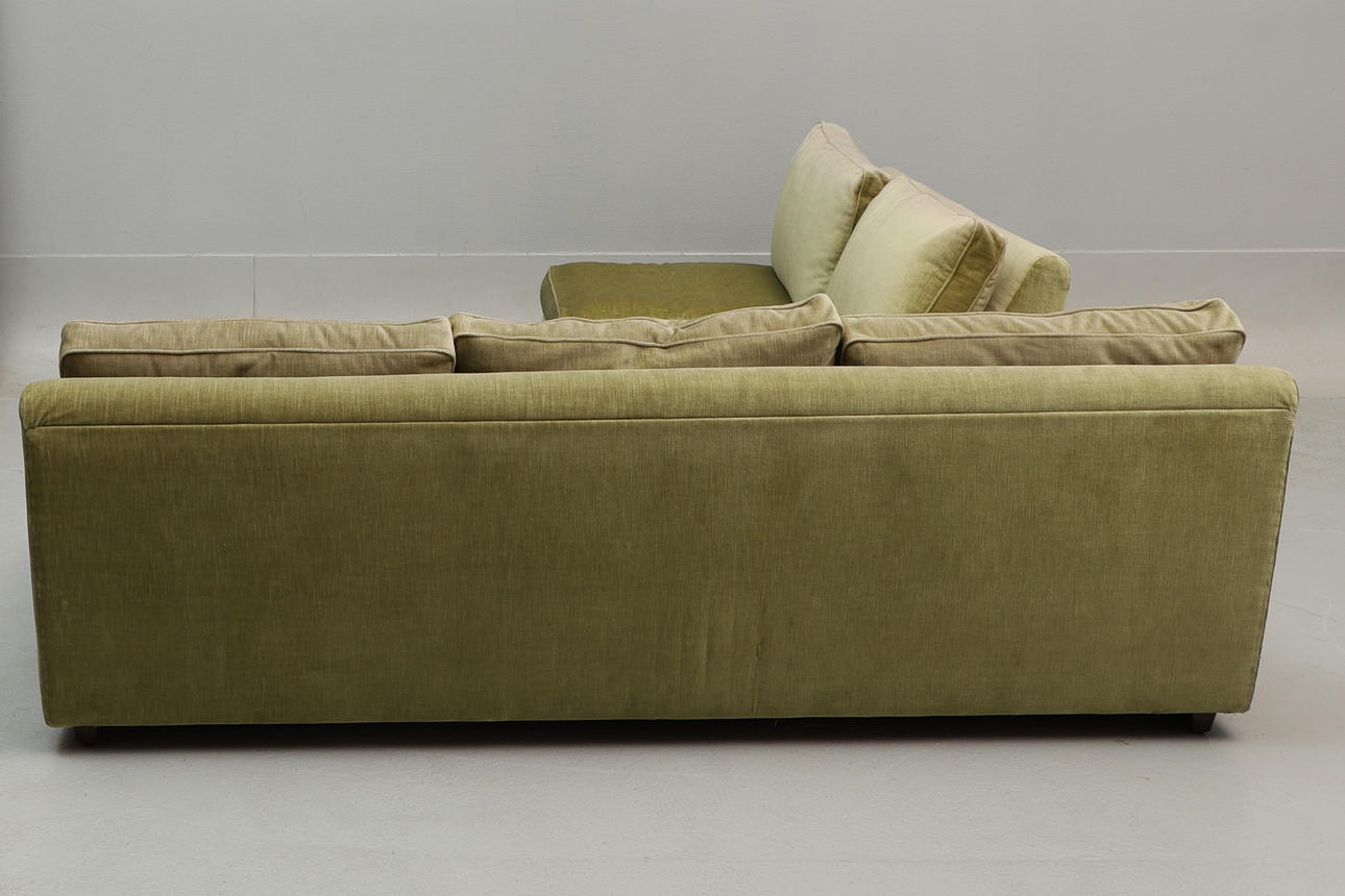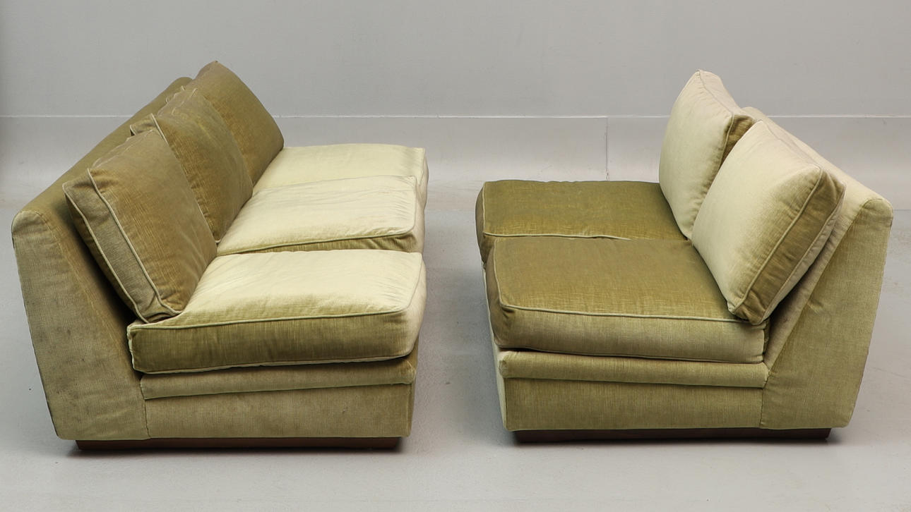 Lösa plymåer. Grön plysch. 3-sits, 198x92 cm, höjd ca 73 cm 2-sits, 131x92 cm, höjd ca 73 cm.
