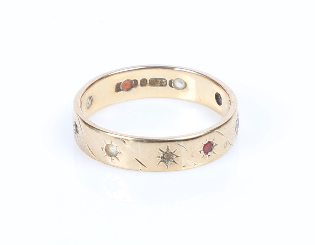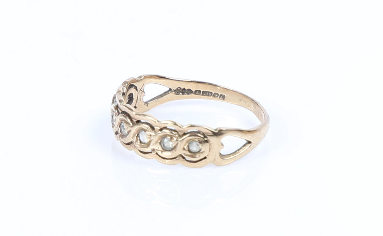 För att inkludera en halvevighetsring med sju stenar. Stämplad ”T&CO, Birmingham, 1981”. Fingerstorlek O.
