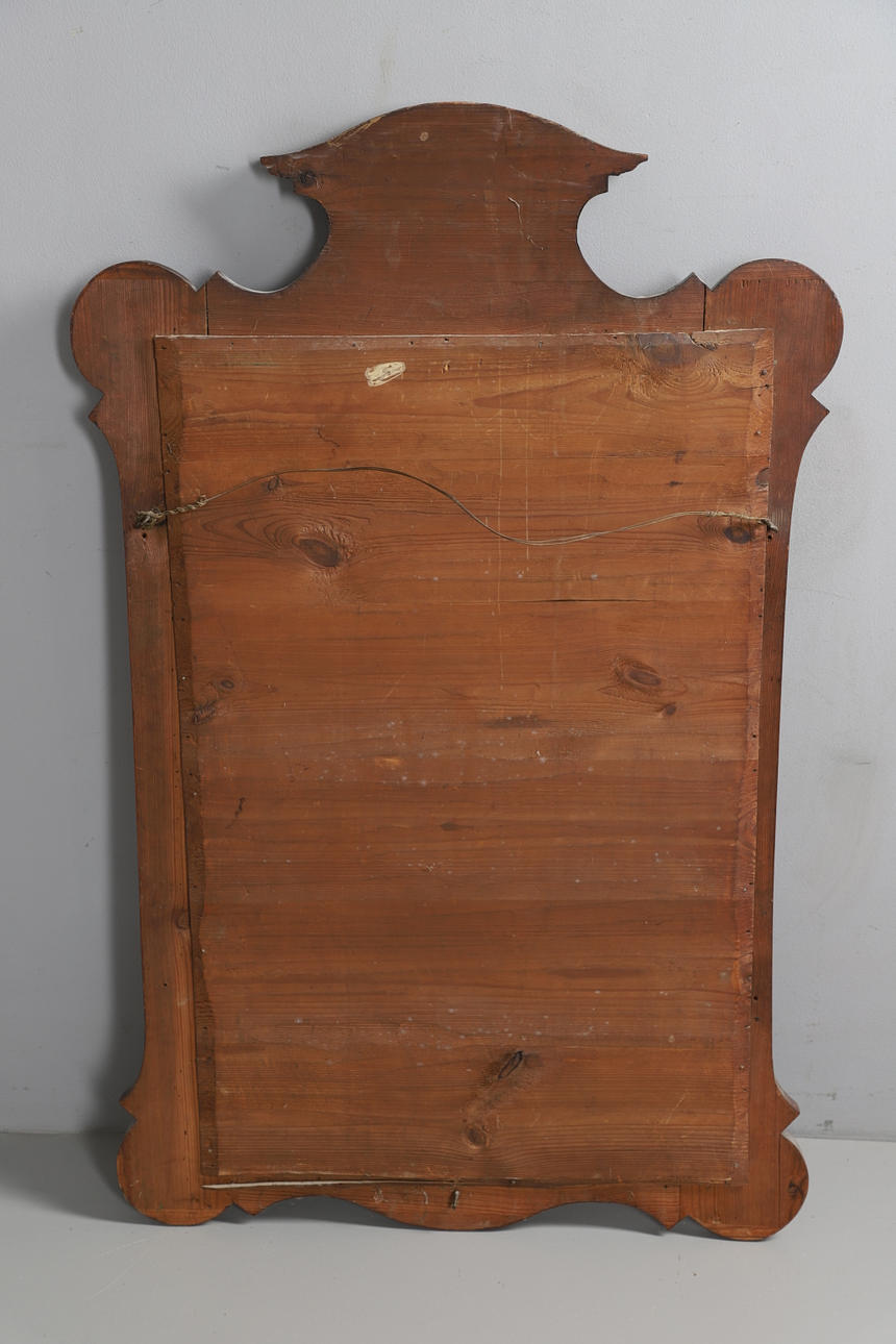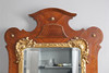 En stor valnötsfanerad på tallspegel, med en välvd topp och med snidad förgylld dekoration runt en fasad glasplatta. 123cms hög.