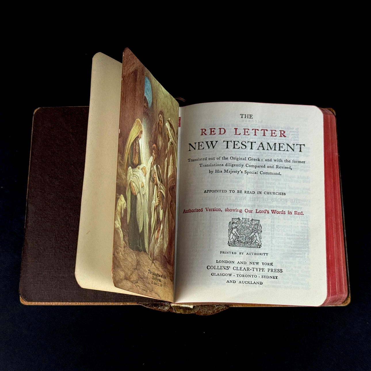 En bok, The Red Letter, Nya testamentet, 1940-tal dekorerad med pärlemor. Utgiven av London och New York Collins Clear-type Press.