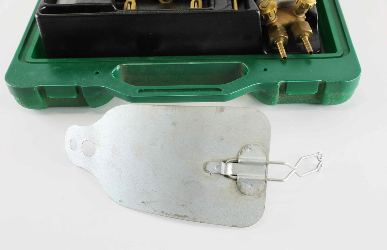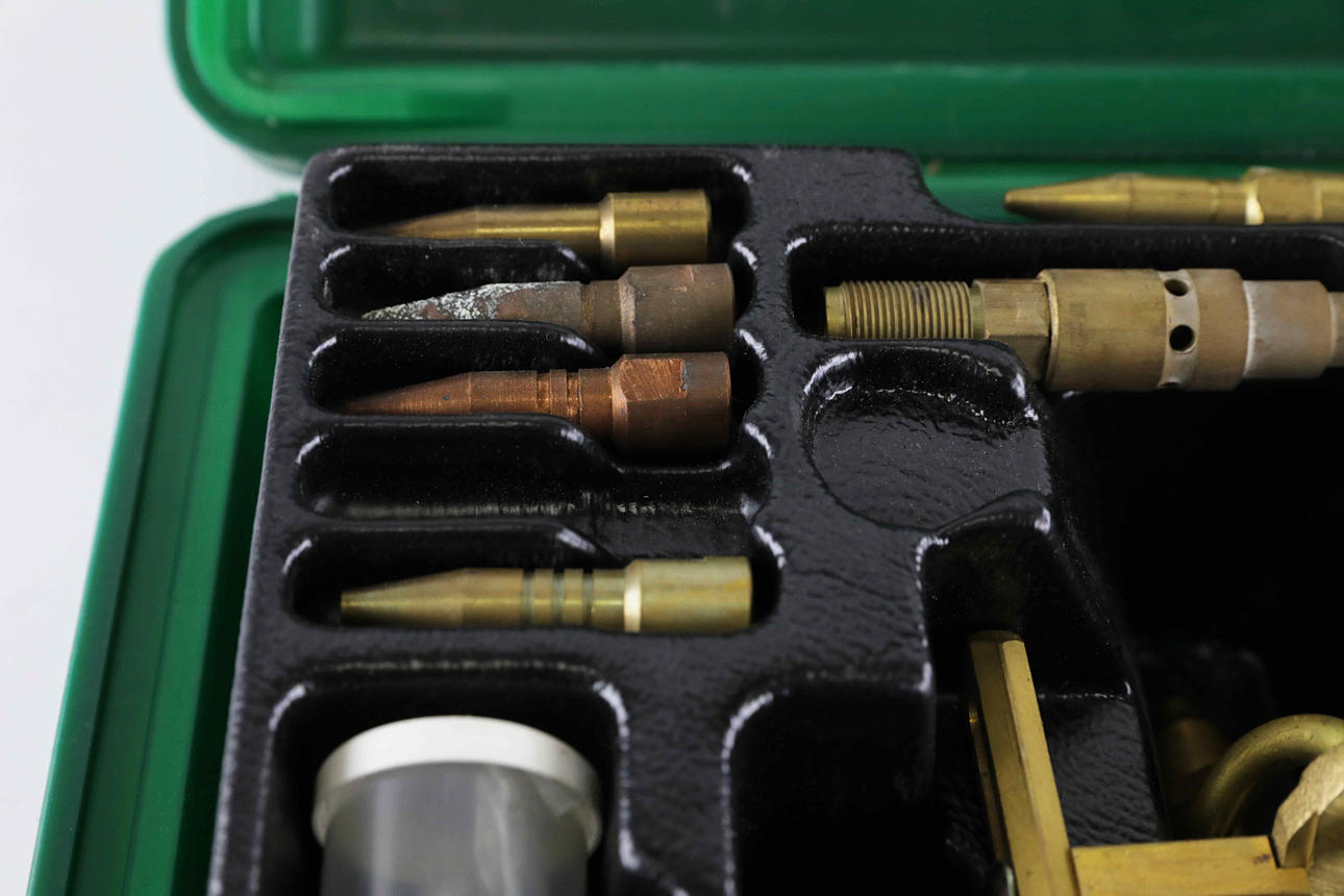 Gassvetshandtag, tillbehör/munstycken. Lådans yttermått 35 x 28 x 8 cm.