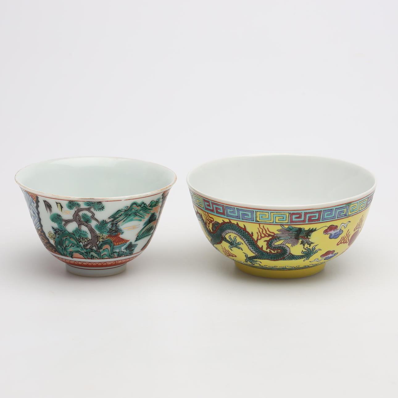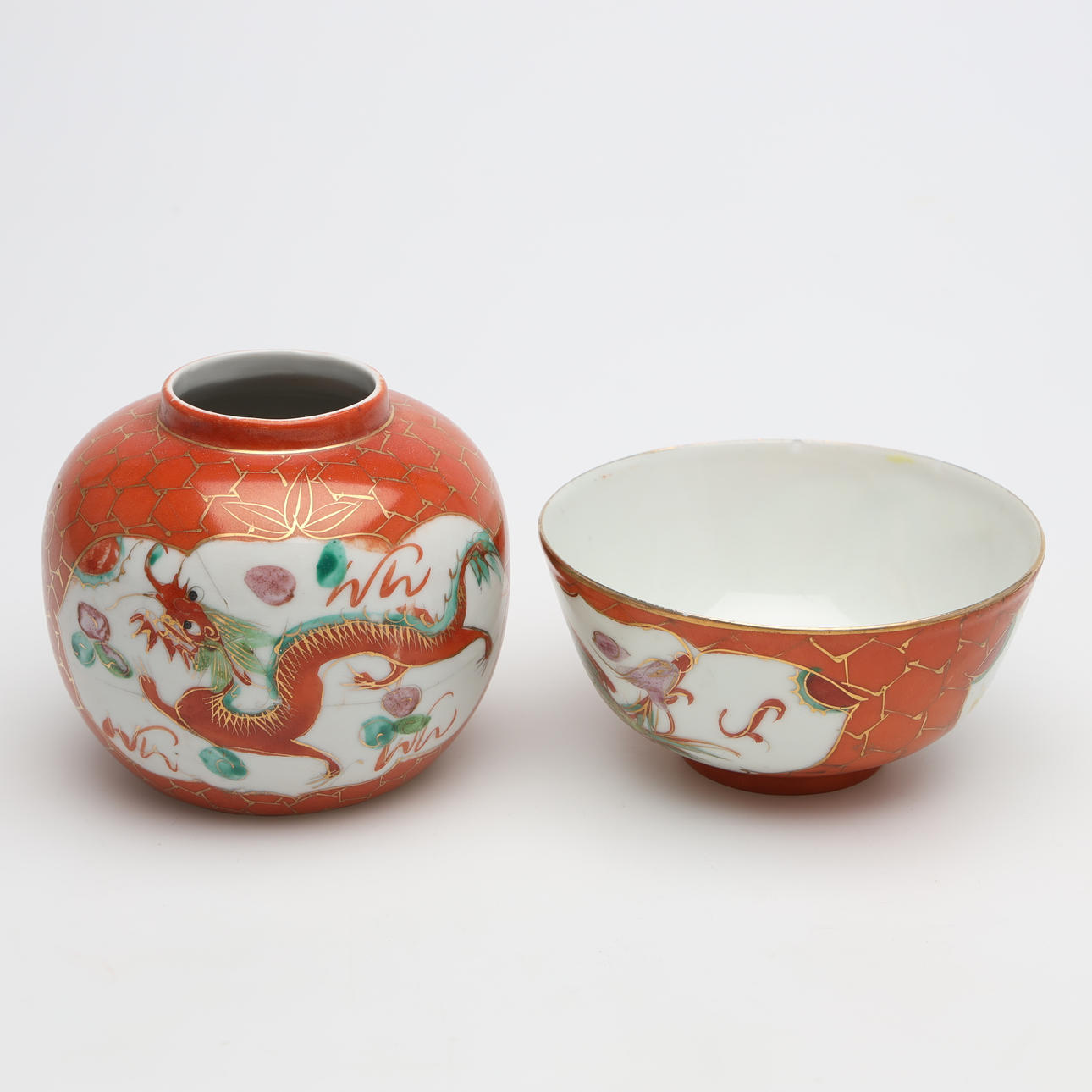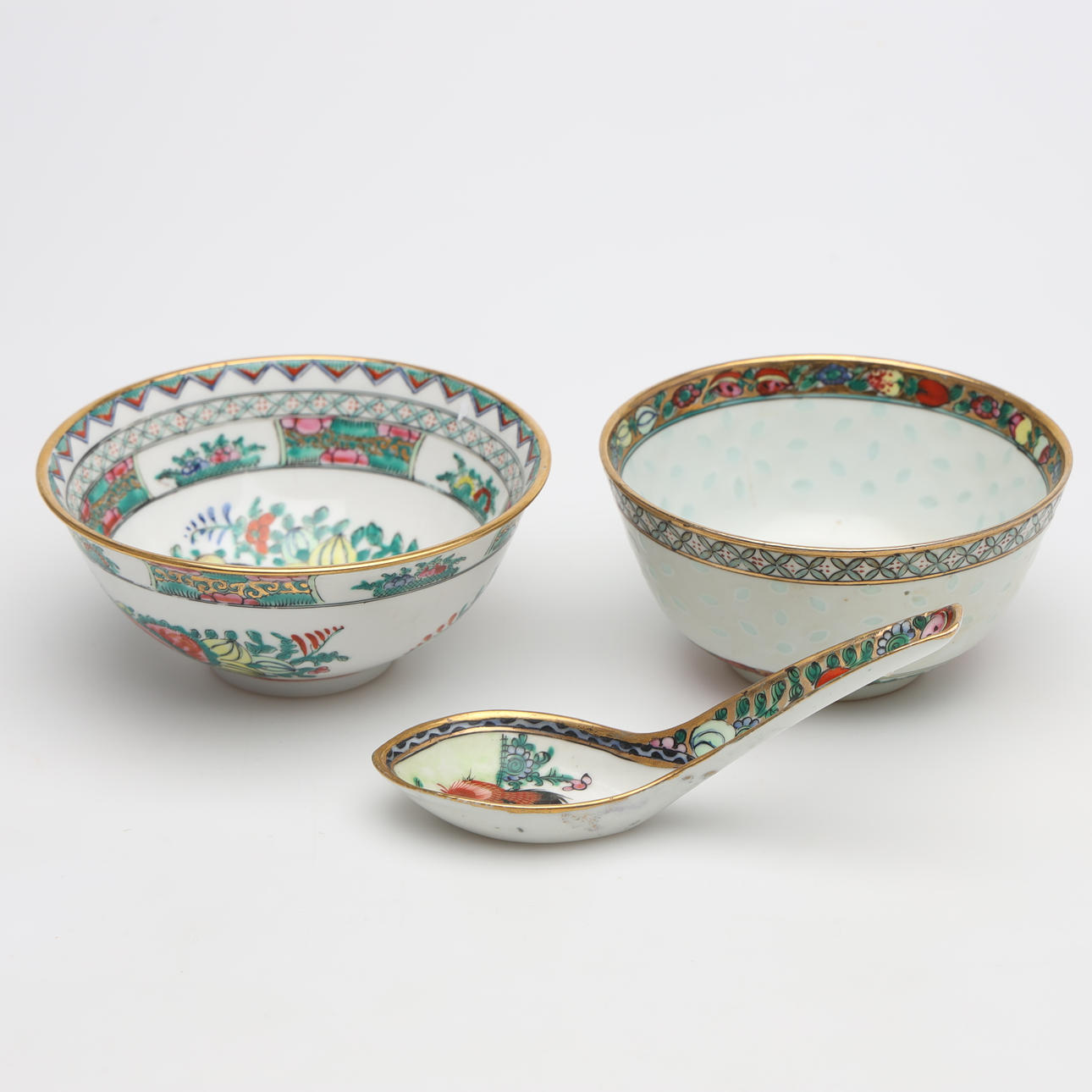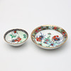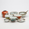 5 st skålar, höjd 5,5-6 cm. 1 st vas, höjd 9 cm. 2 st fat, diameter 7-10 cm. 1 st sked, längd 14 cm.