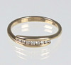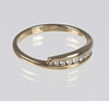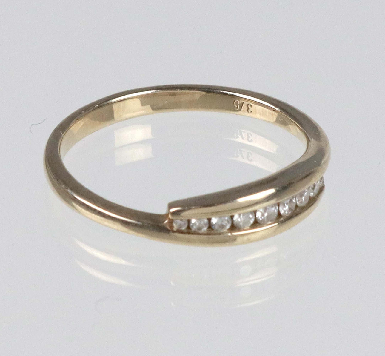 Diamantring, stämplad 375 gult guld (9 karat), ca. 2.3 gram, det kammerade ringbandet uppdelat mot ringhuvudet är infattat med 9 briljantslipade diamanter i fastspänningsinställning, RG 56, innerdiameter 17.8 mm.