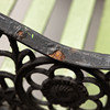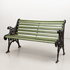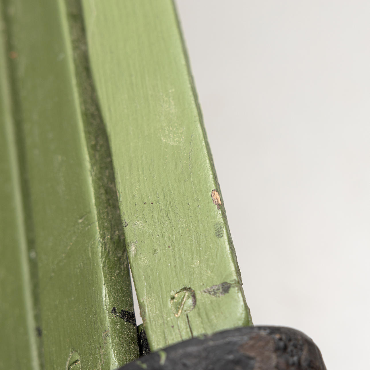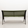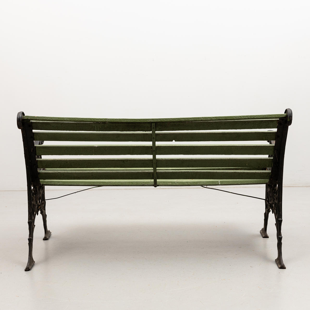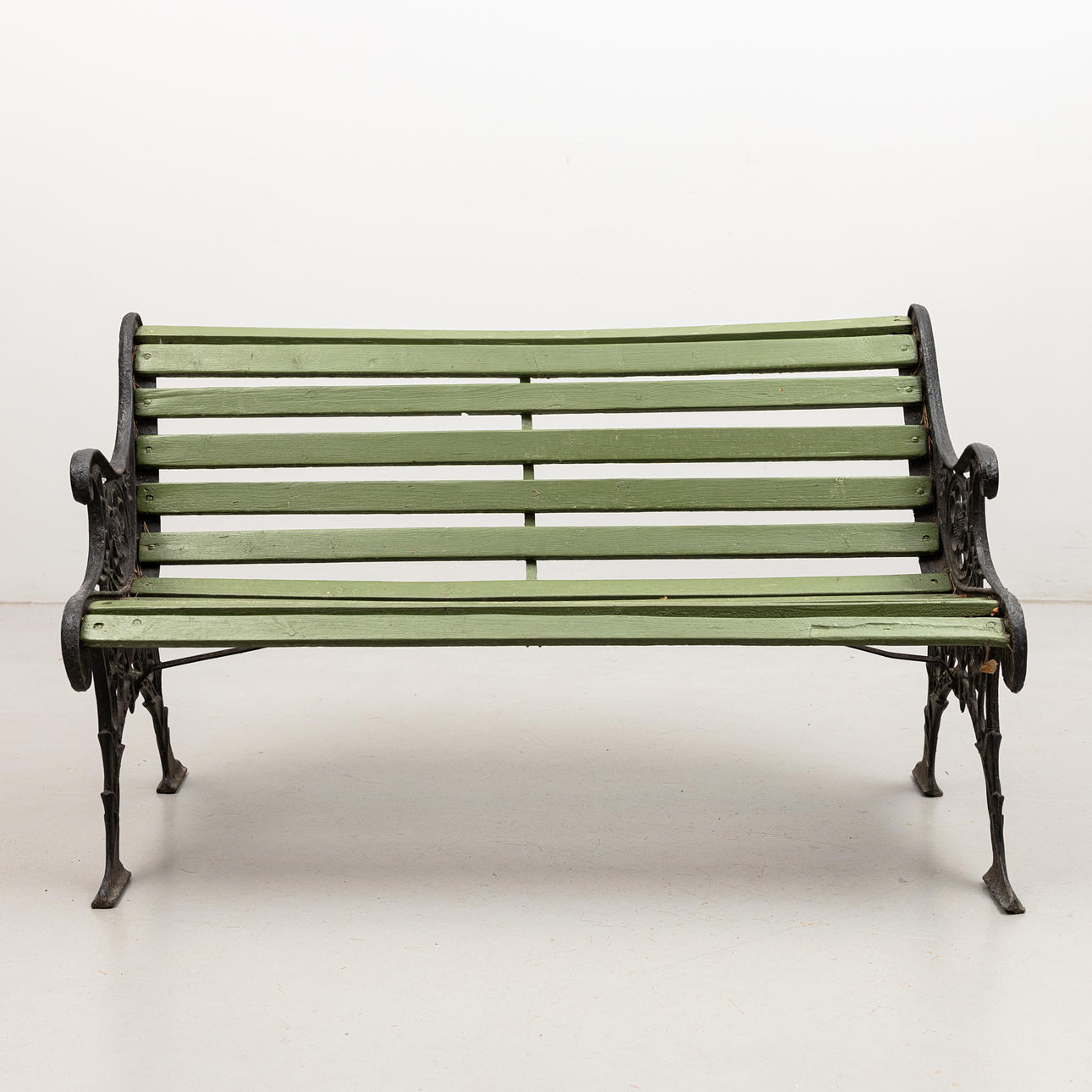 Grönmålade med gavlar av floral dekor. Bredd ca 126, djup 74 och sitthöjd 42 cm.