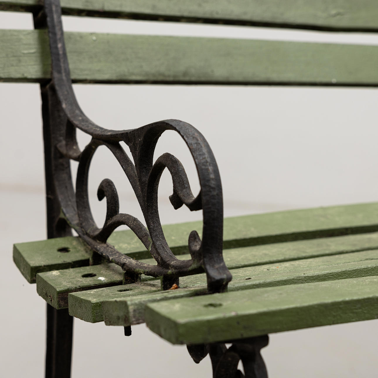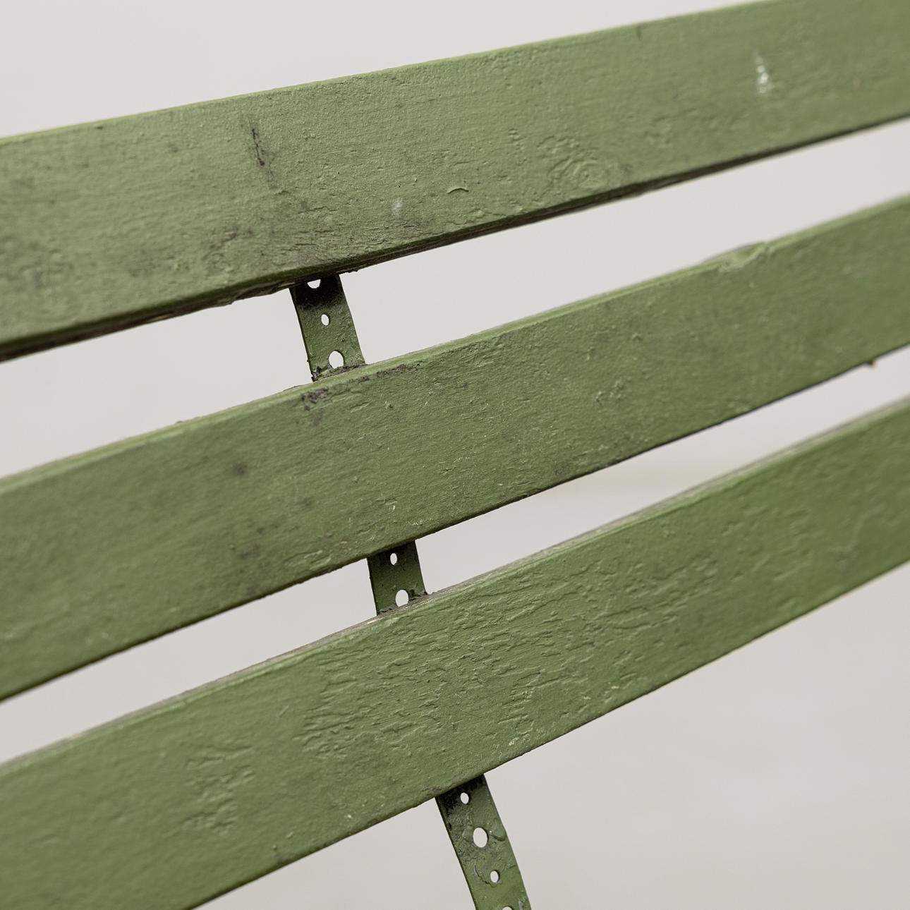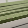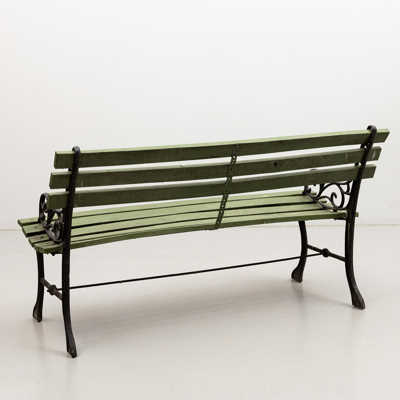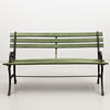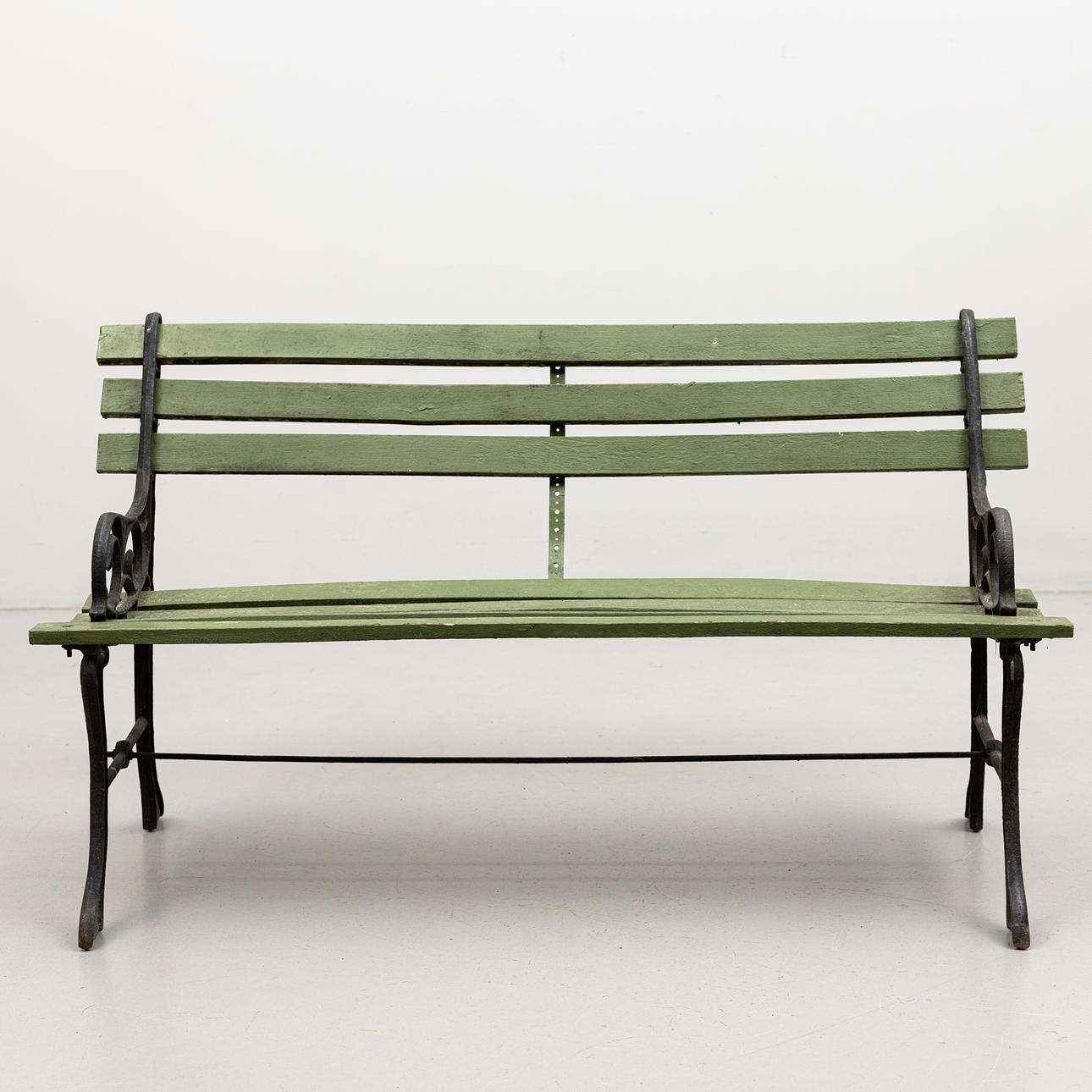 Grönmålad, bredd ca 122, djup 34 och sitthöjd 38 cm.