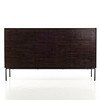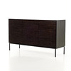 Handskuren massiv mörktonad teak, svartlackerat stålunderrede, inredd med hyllplan, höjd 87, 152x45 cm.