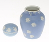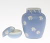 Dekor av vita blommor på blå botten. Vasens höjd ca 14 cm.