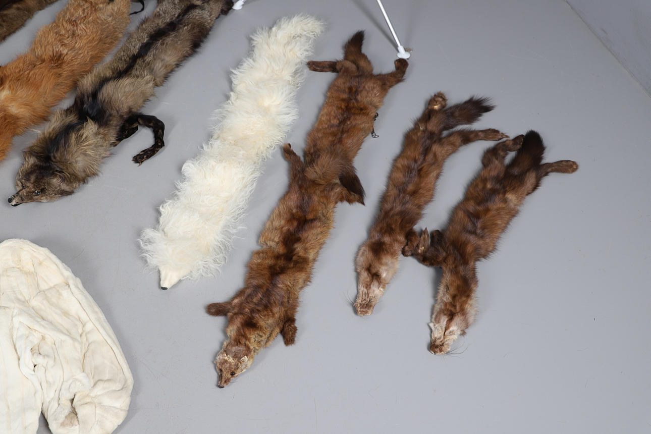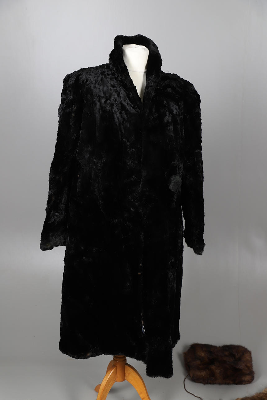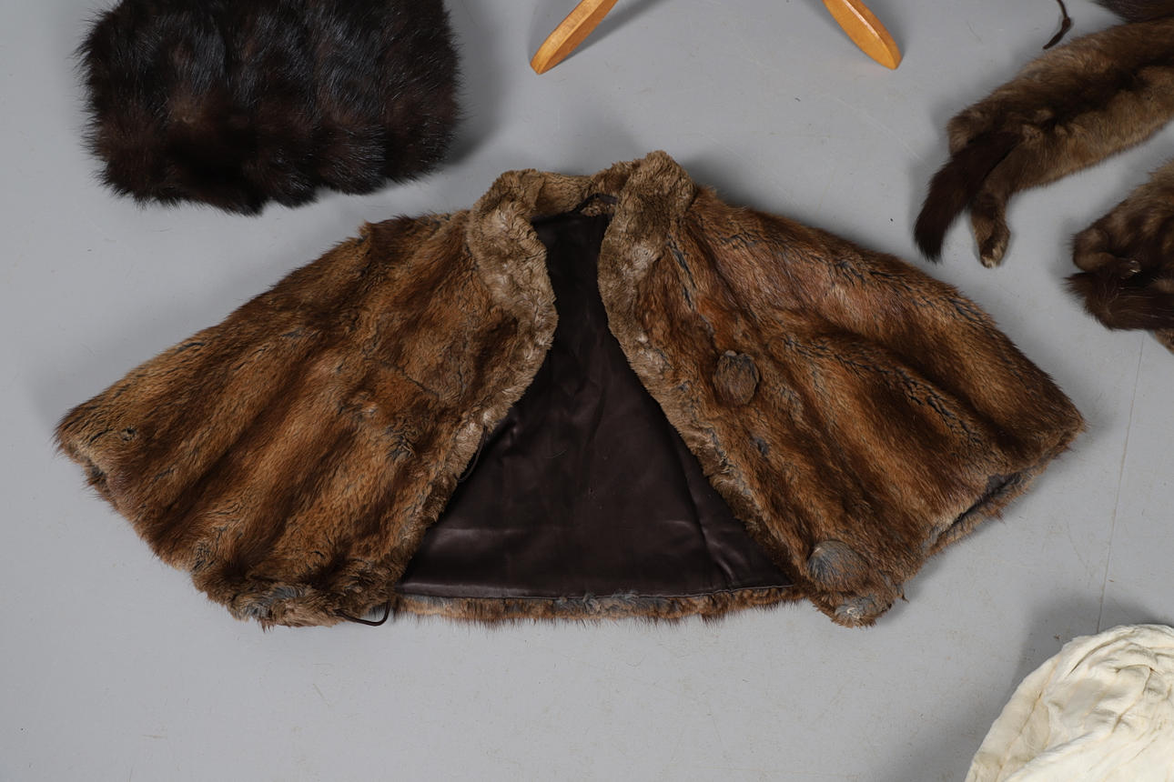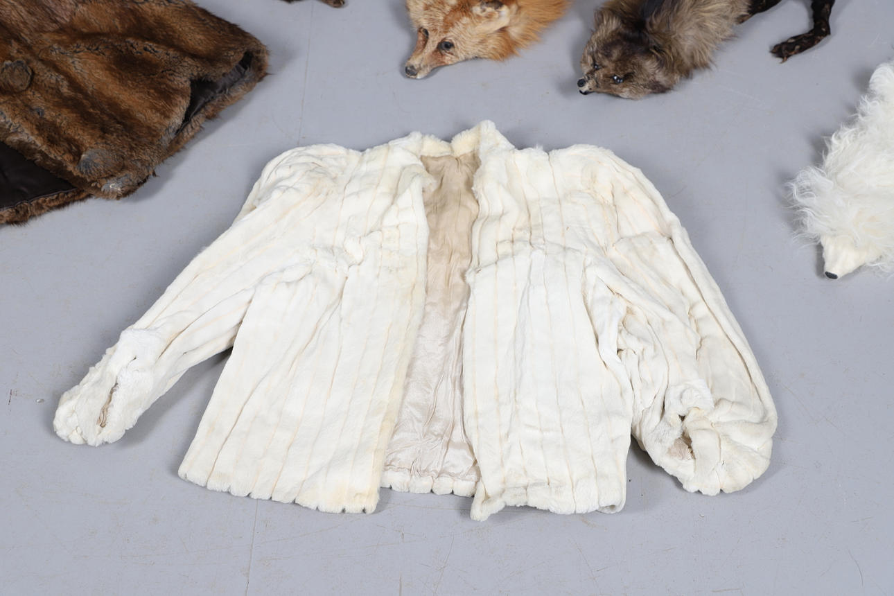 Ett blandat parti vintage pälsar inklusive en 20:e svart päls med blommigt sidenfoder, en rävtipp, två rävkrage, två pälsmuffar, en cape, en Lewis & Allenby jacka, en vit päls kvällsjacka och tre krage.