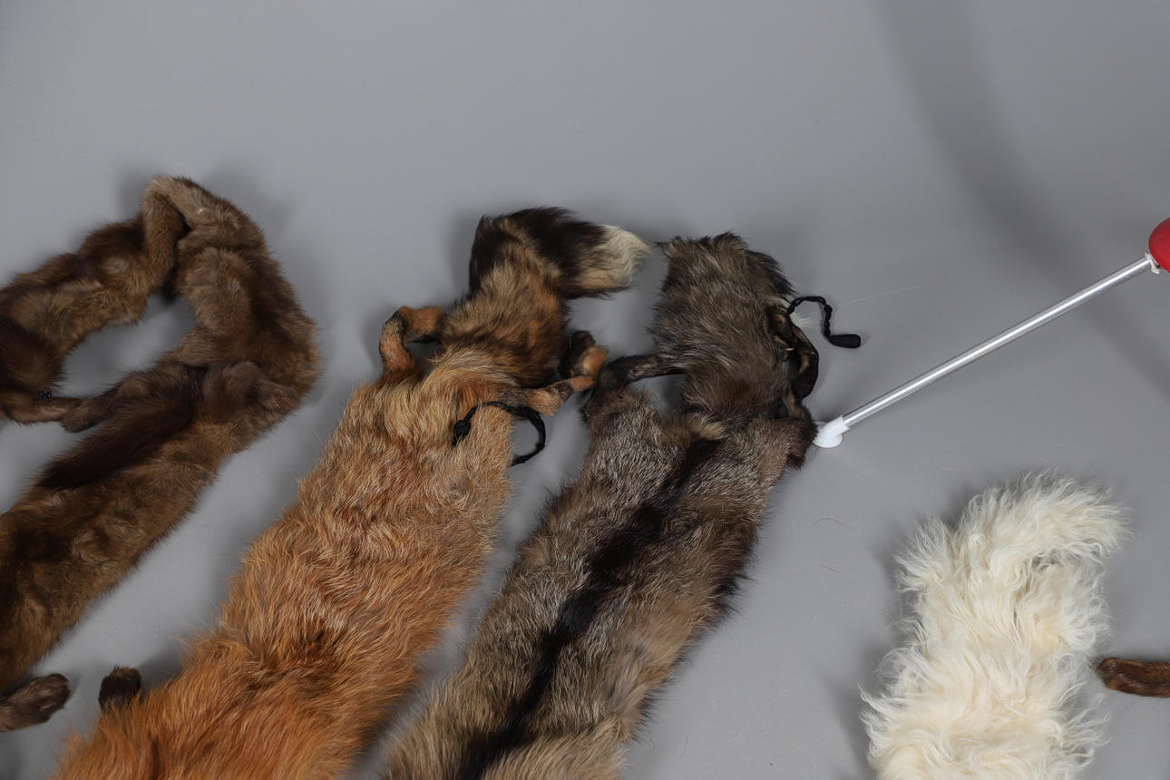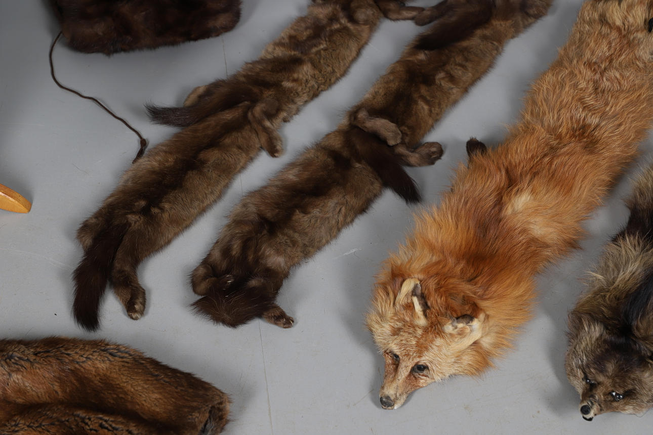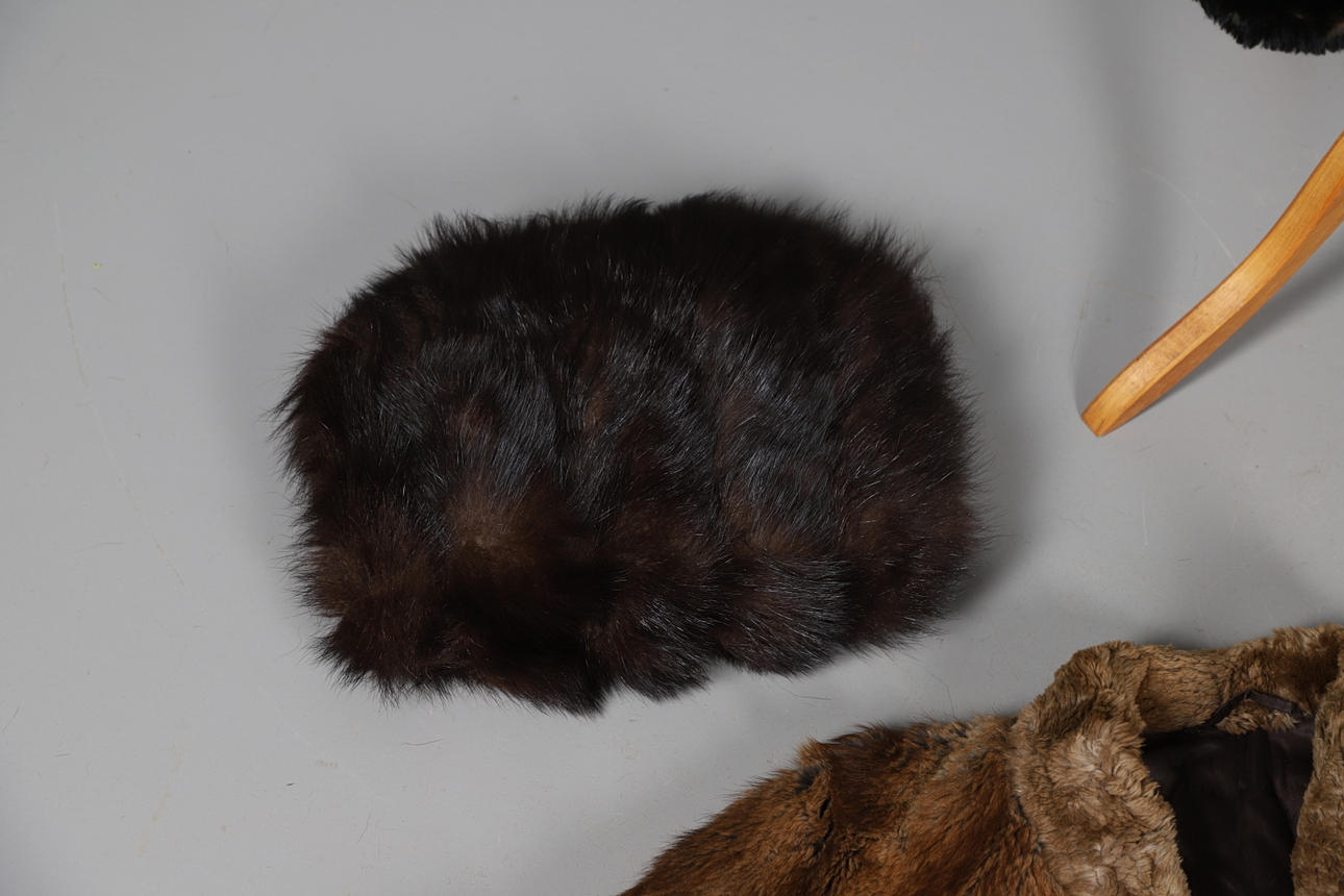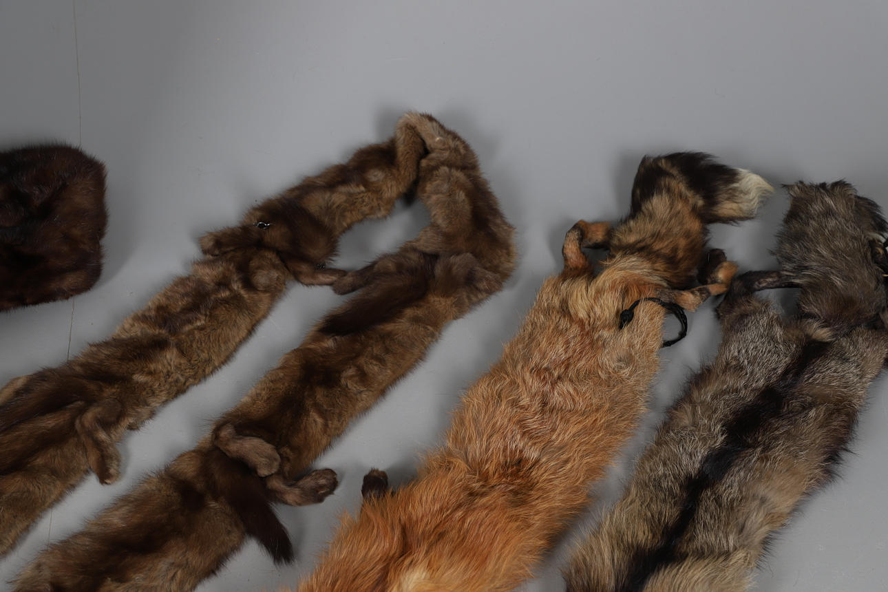 Ett blandat parti vintage pälsar inklusive en 20:e svart päls med blommigt sidenfoder, en rävtipp, två rävkrage, två pälsmuffar, en cape, en Lewis & Allenby jacka, en vit päls kvällsjacka och tre krage.