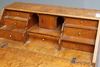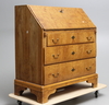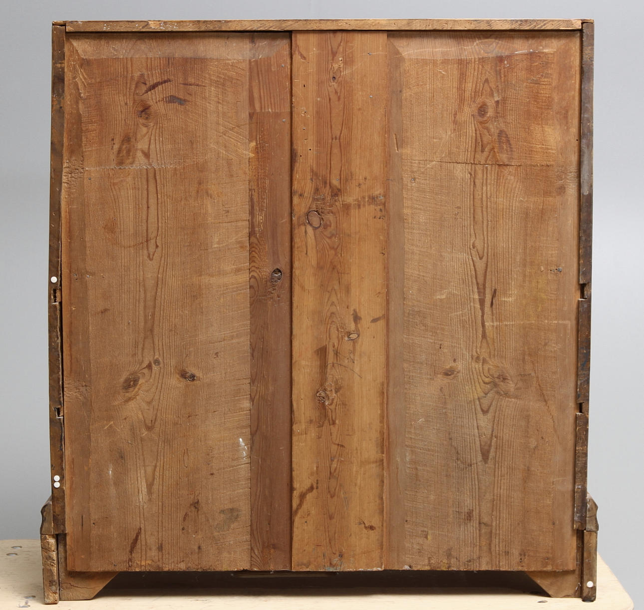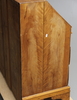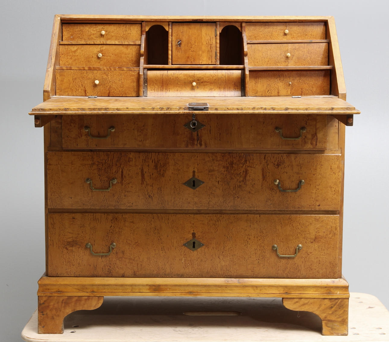 Fanerad i masurbjörk, handtag och rombformade nyckelskyltar i mässing, inredd med sju lådor, lådknoppar av ben. Nyckel medföljer. Längd 91, bredd 45, höjd 99 cm.