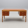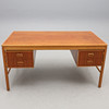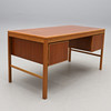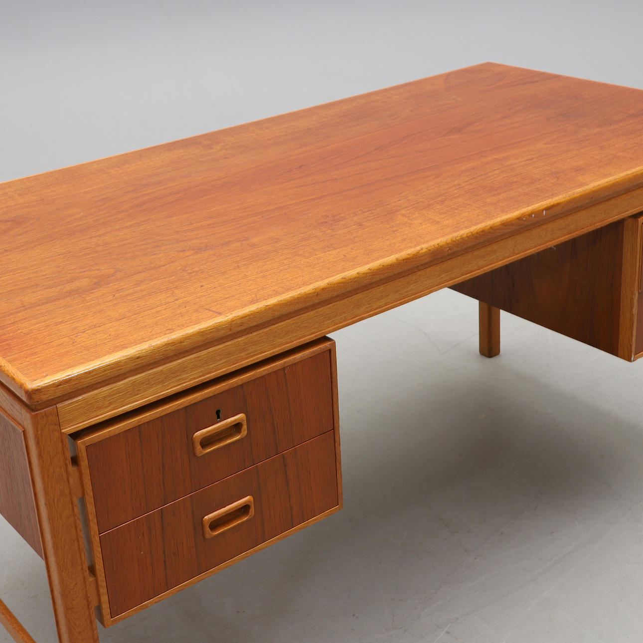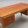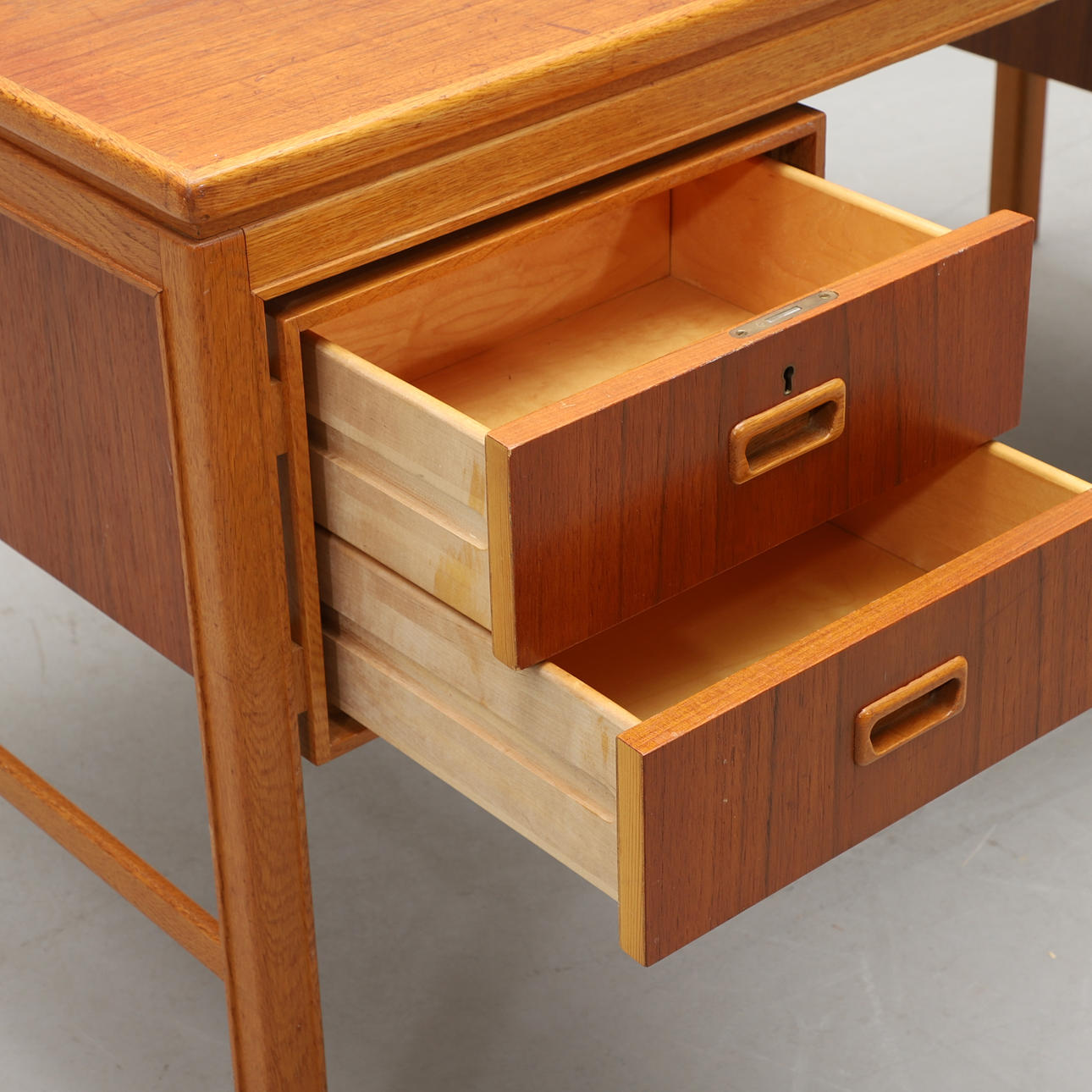 Ek och teak. Rektangulär skiva, två hurtsar med vardera två lådor. Kopplade ben. Längd 148, djup 75, höjd 75 cm.