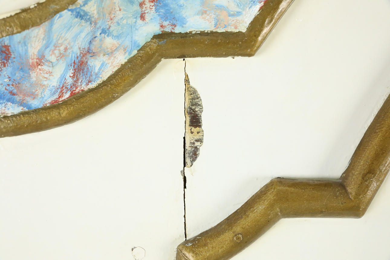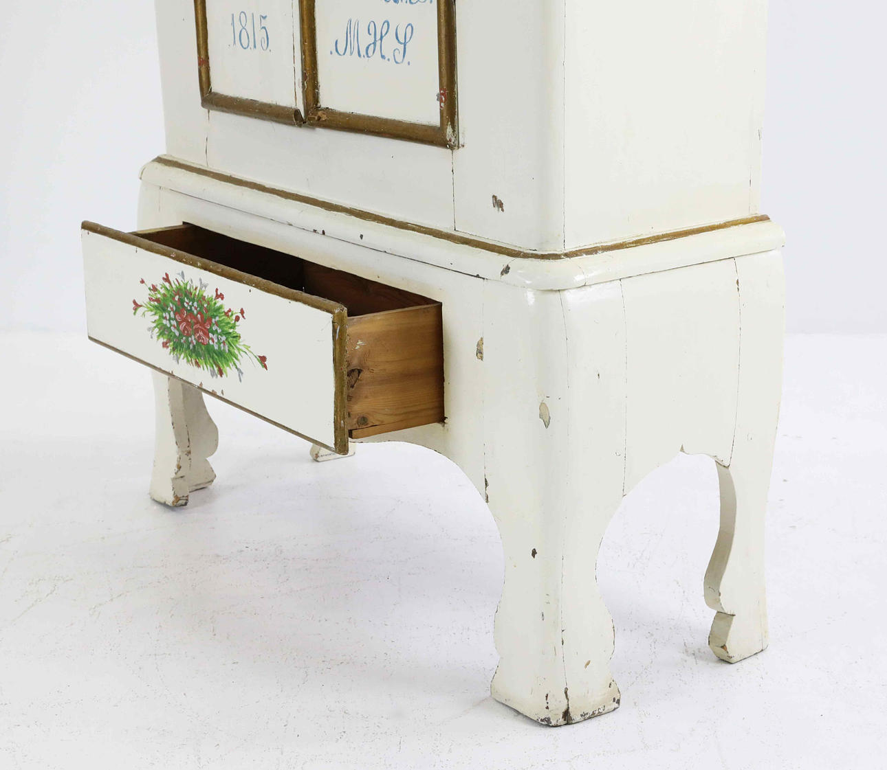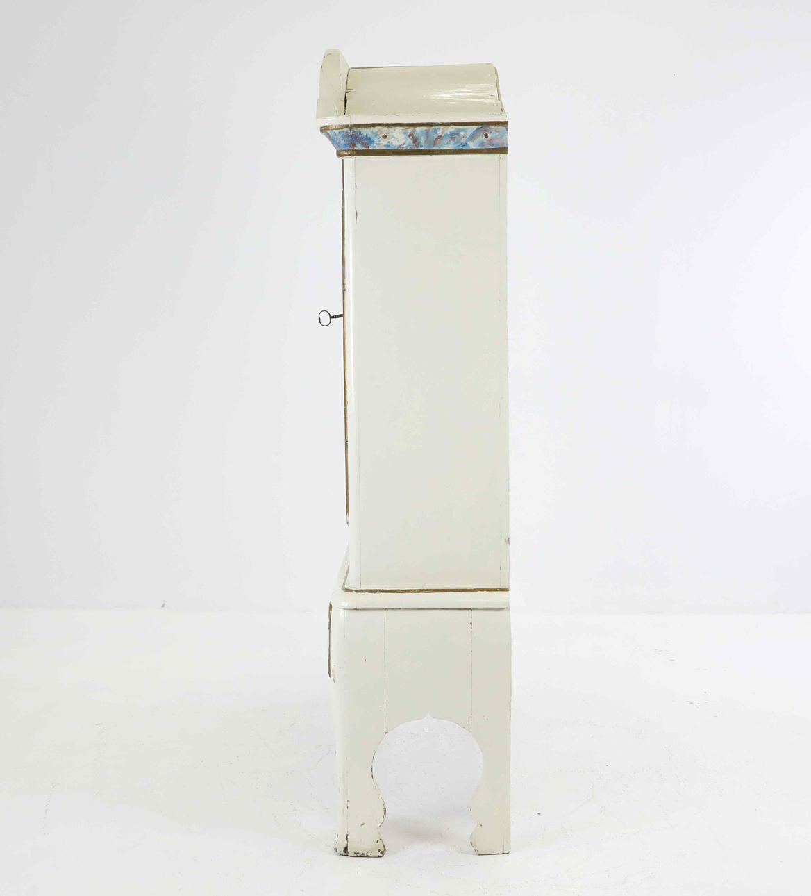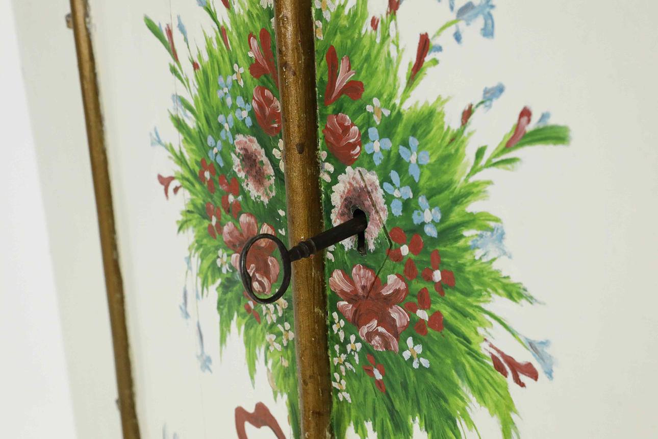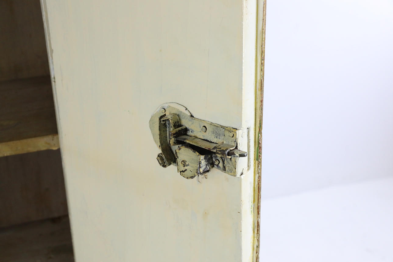 Senare målat, förekommer slitage. Orignalfärg främträder ställvis under. Lås fungerar ej.