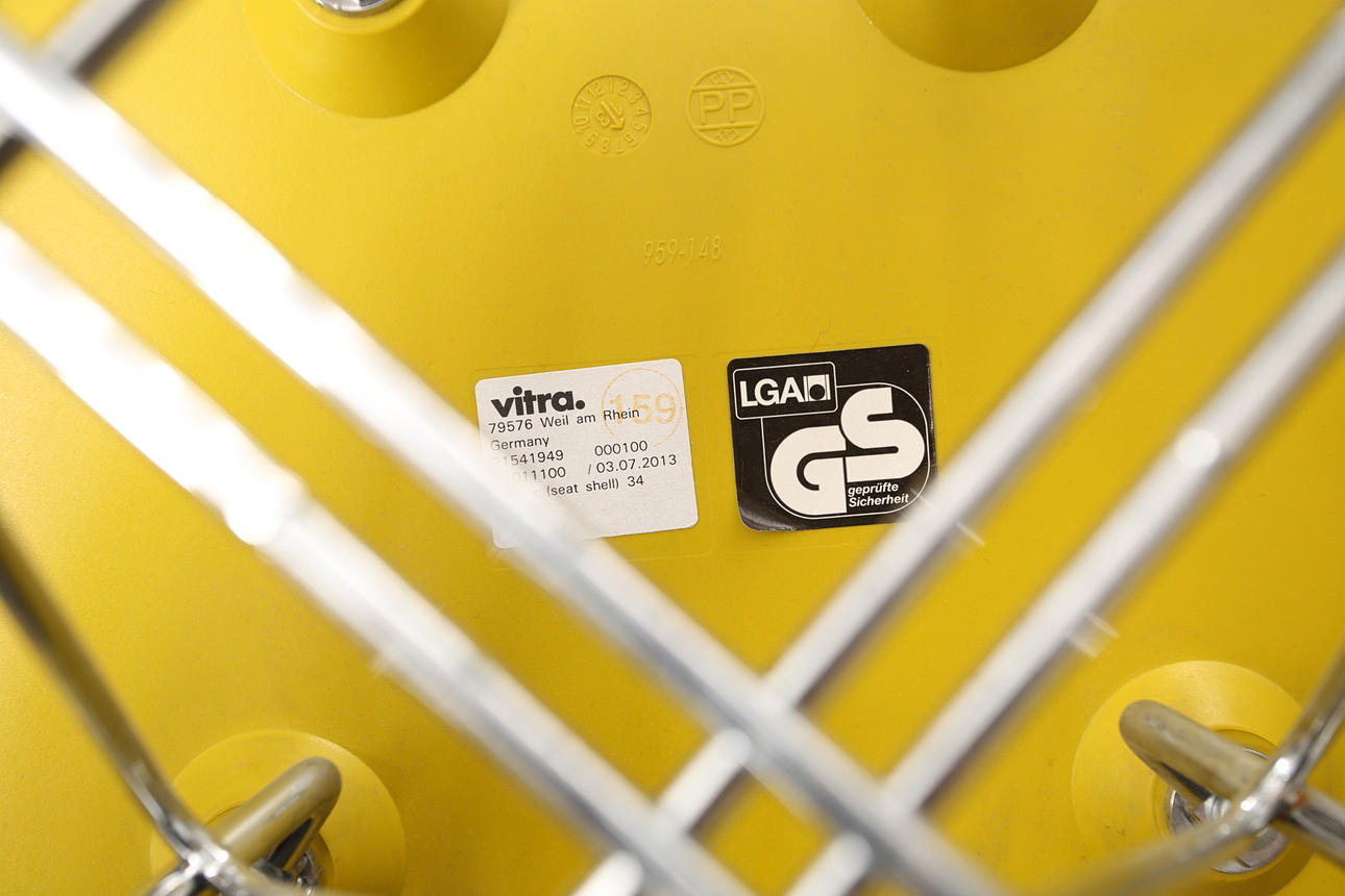 Limegrön med benställning i kromat stål, etikettmärkt, formgiven 1950. Rygghöjd 80 cm Sitthöjd ca 46 cm.