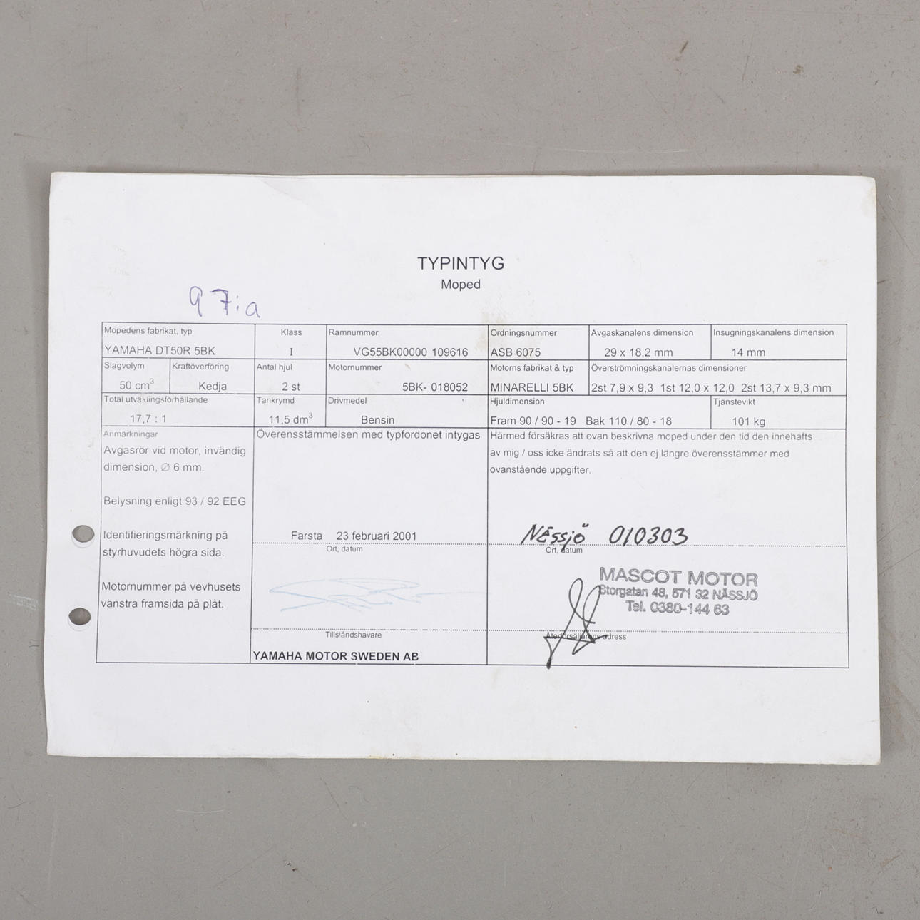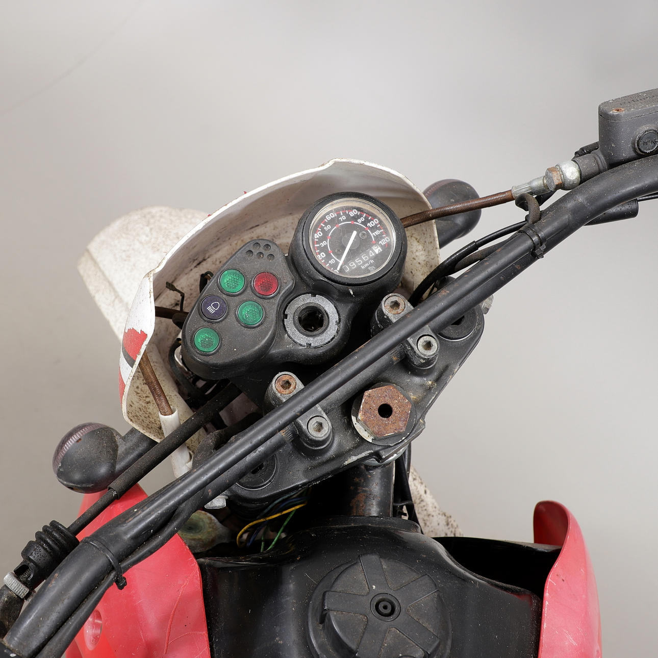 Styrhöjd ca 110 cm, längd ca 210 cm. Motor märkt "Motori Minarelli Italy, 5BK".
