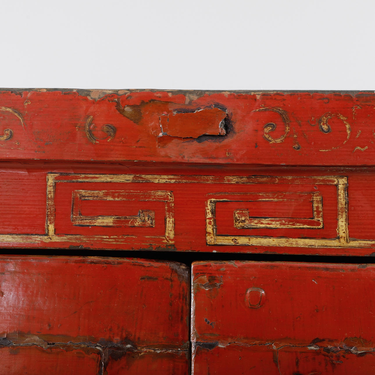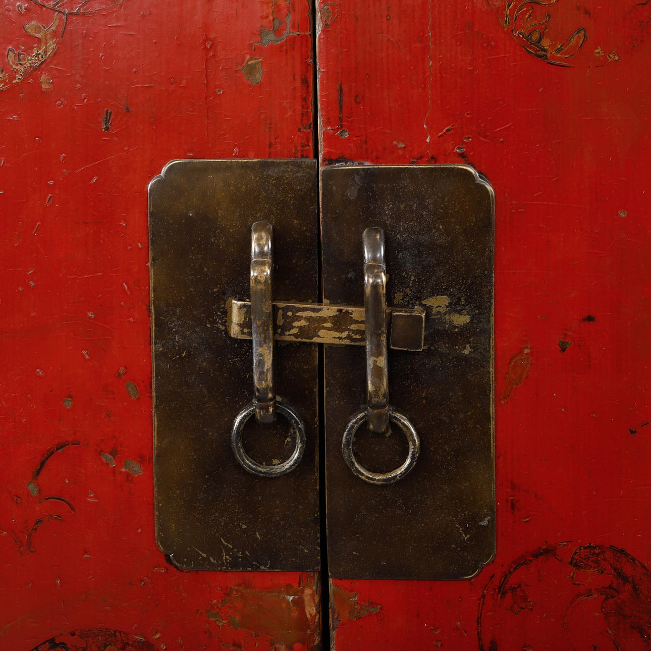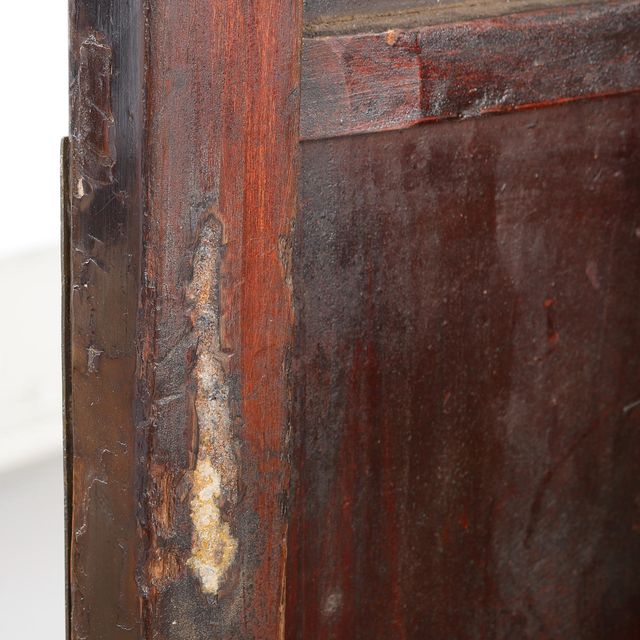 Bruksslitage. Färgbortfall. Skador och lagningar. Urtaget hål i bakstycke.