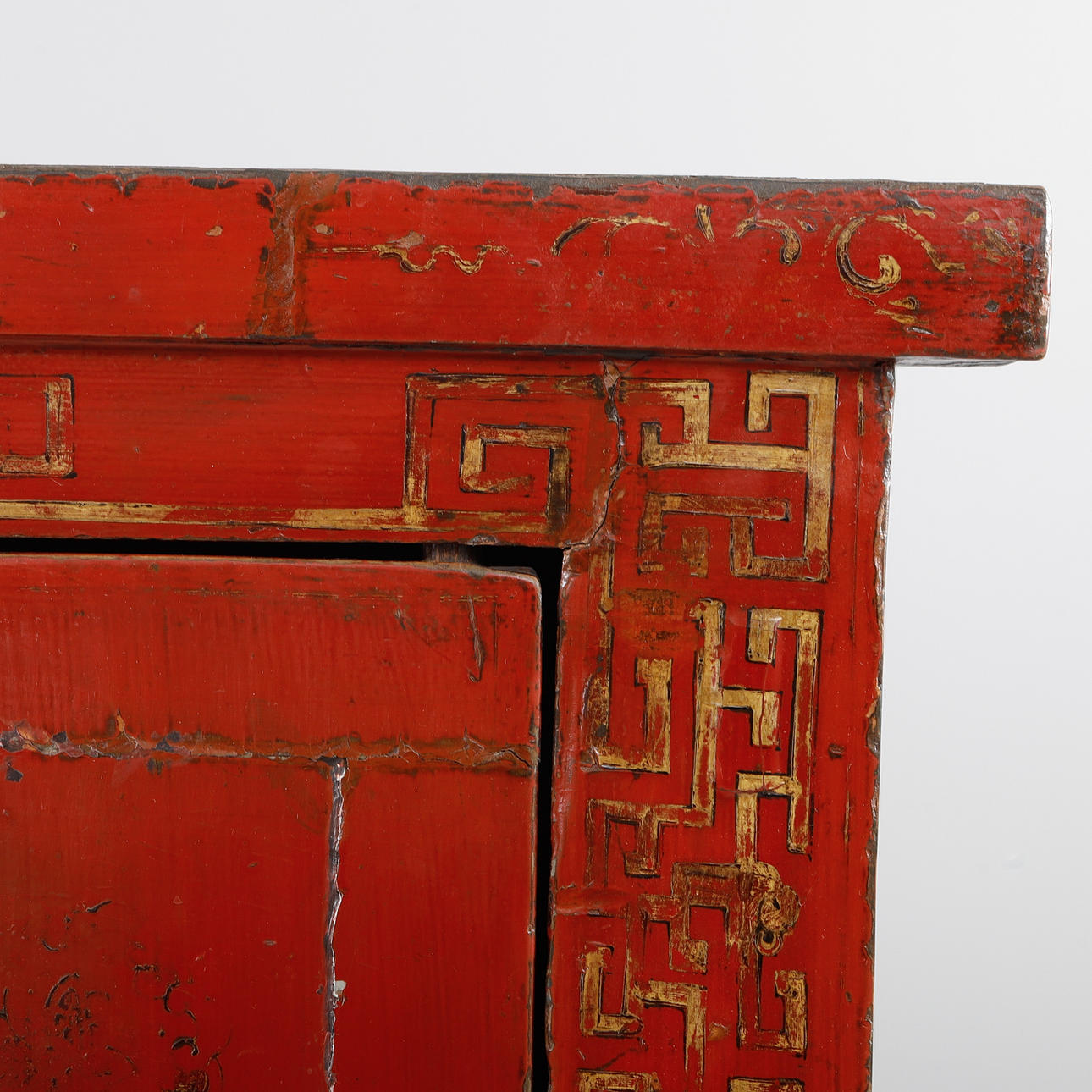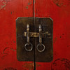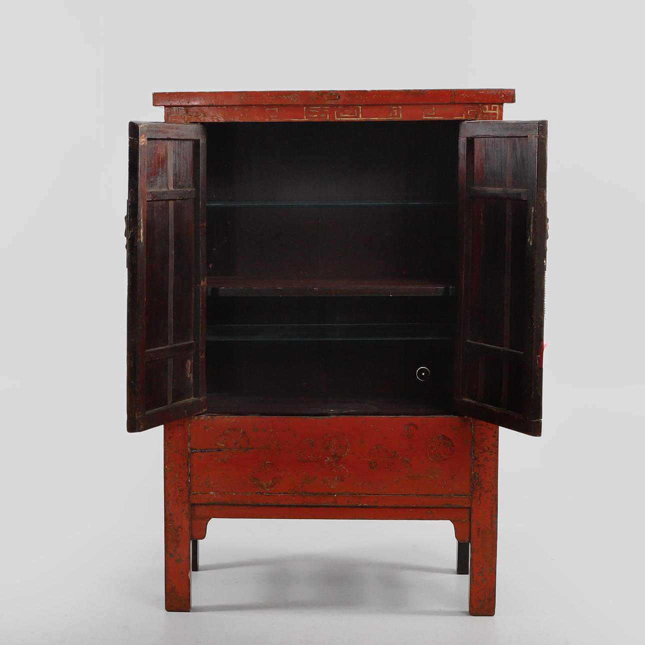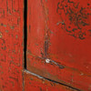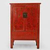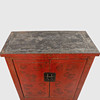 Rödlackat med dekor av bl.a fjärilar. Dörrpar med bakomvarande hyllor. Bredd ca 110 cm, djup 52 cm, höjd ca 162 cm.