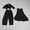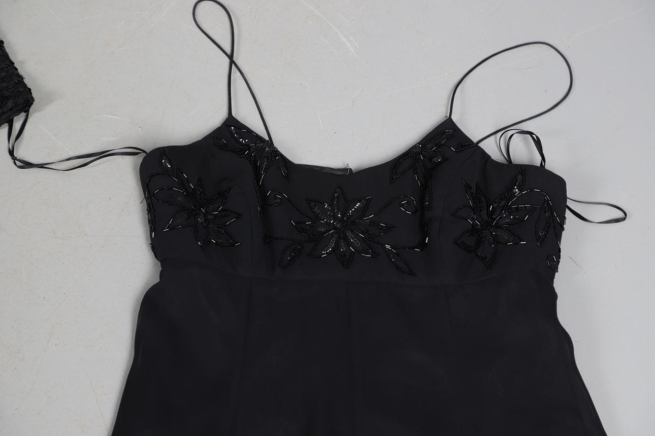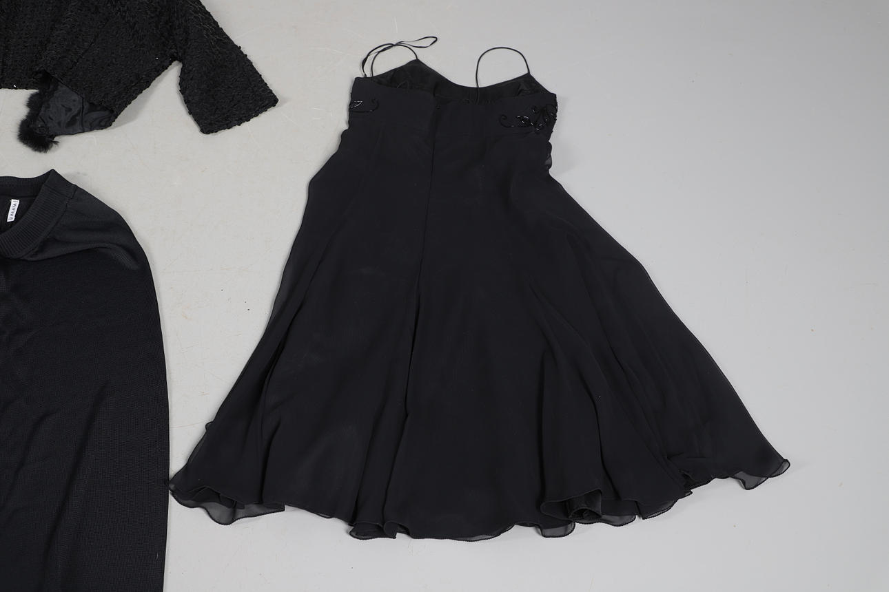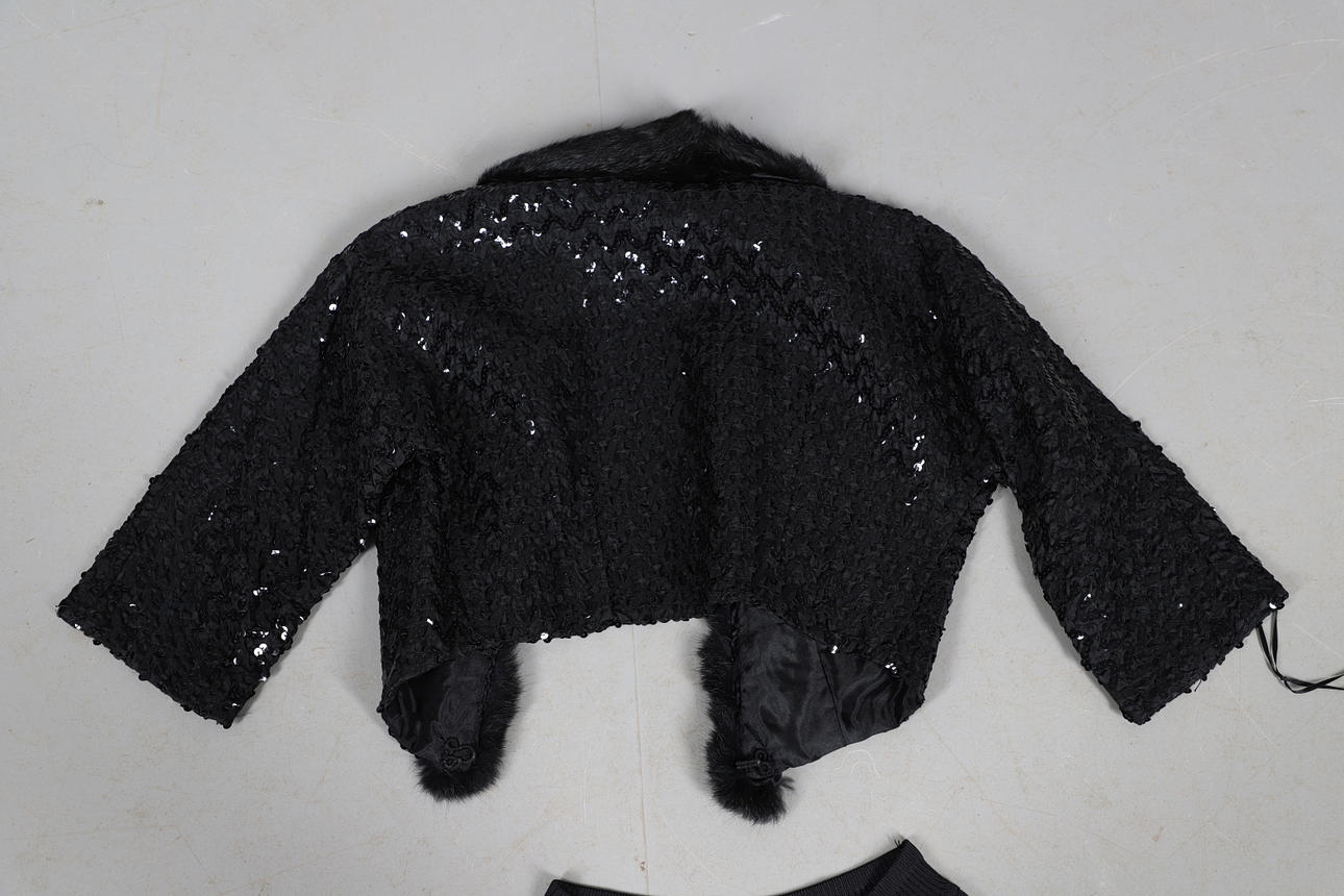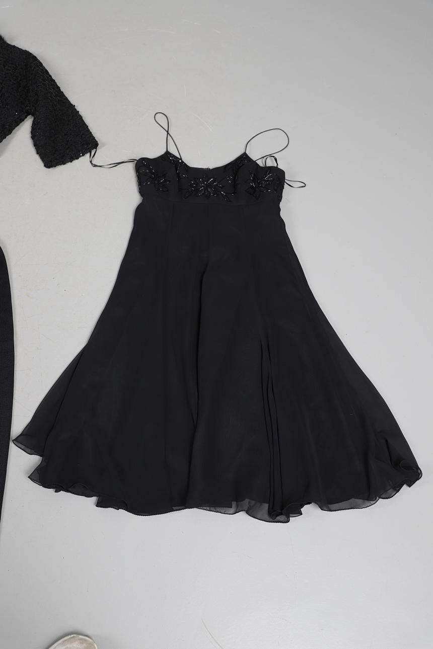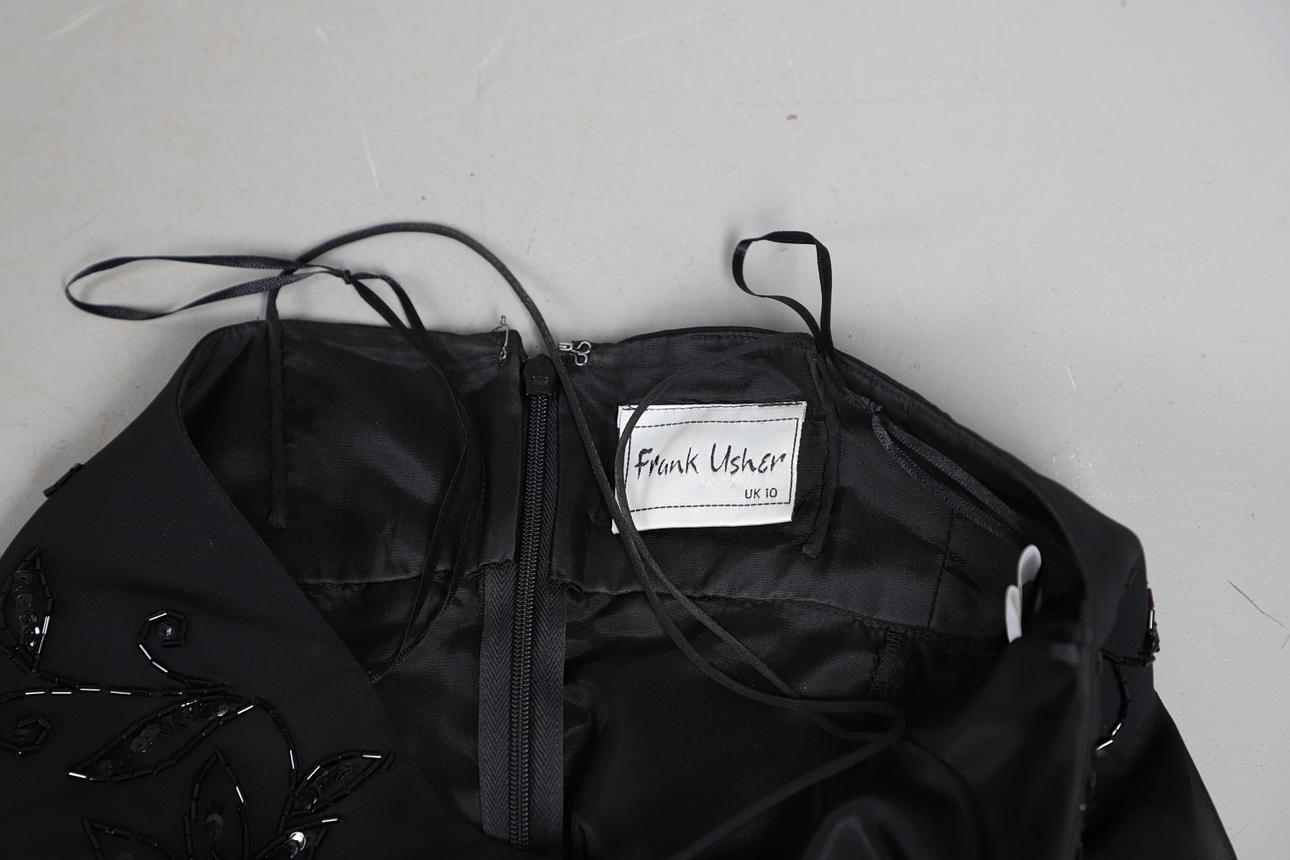 Inklusive en Frank Usher svart cocktailklänning, cirka 1980-tal, överdelen utsmyckad med paljetter och bugglepärldekoration, etikettstorlek 10. Även med ett par Alaia lösa ben viskose/rayonbyxor med resår i midjan, etikett XS (Made in Italy), och en Blanes of London svart paljettkvällsjacka med pälskrage, etikettstorlek 12.