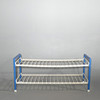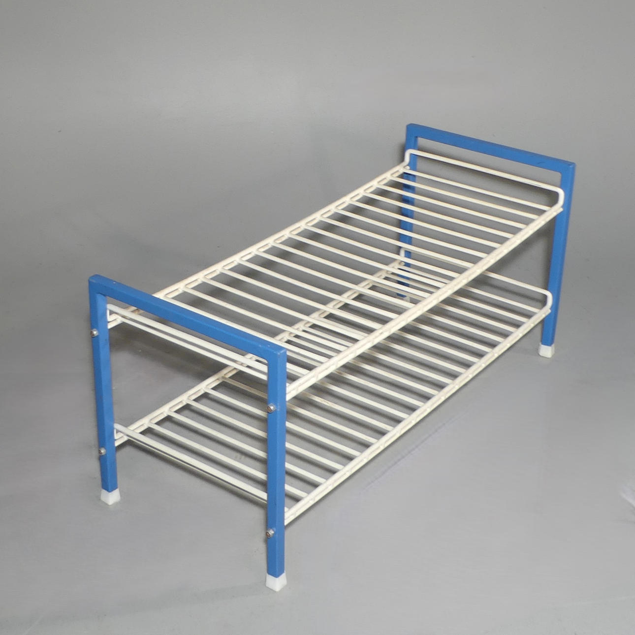 Blå sidogavlar i metall, hyllplan i vit string. Höjd 36 cm, längd 80 cm, djup 32 cm.