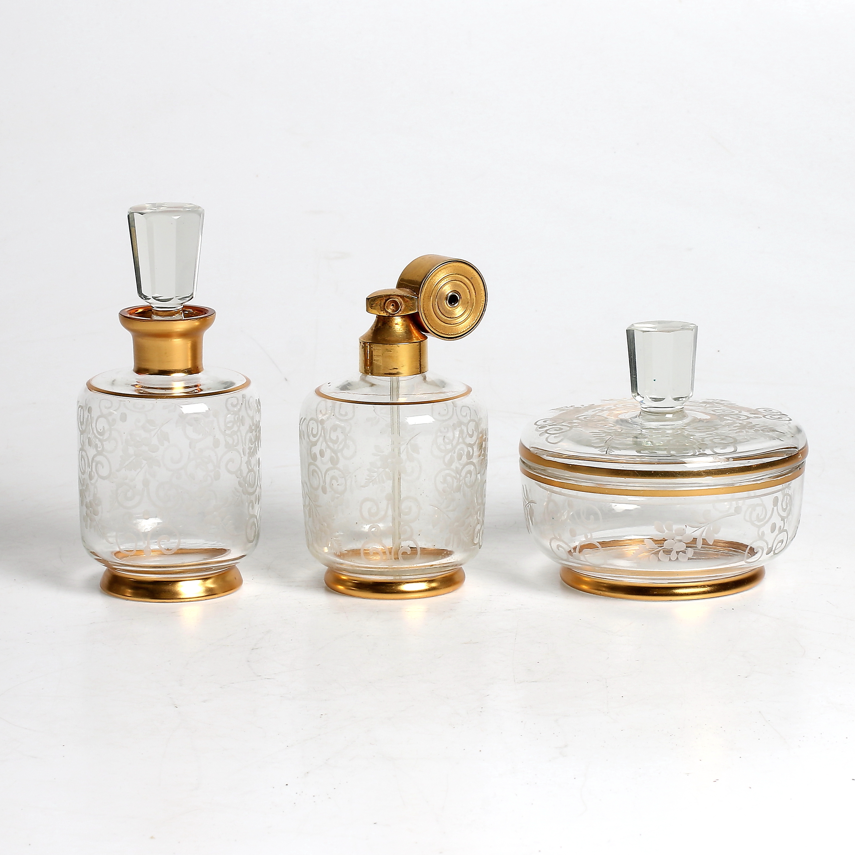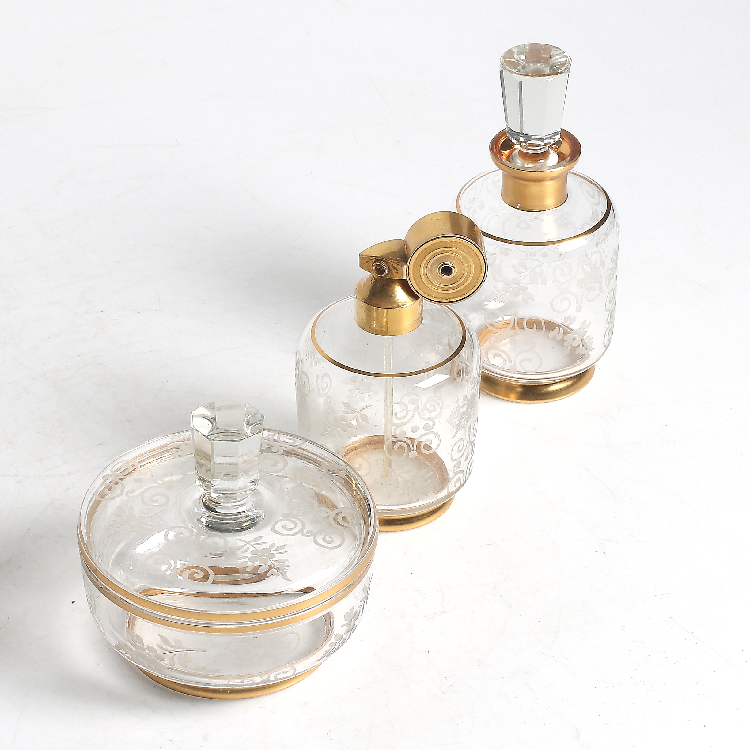 360178. PARFYMFLASKOR samt LOCKSKÅL, 3 delar, glas, 1900-tal.